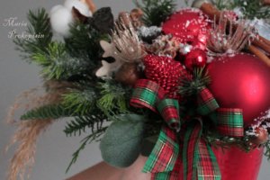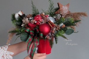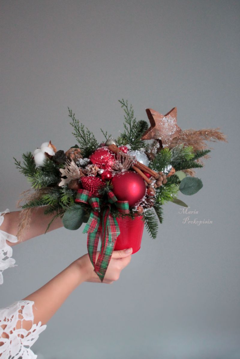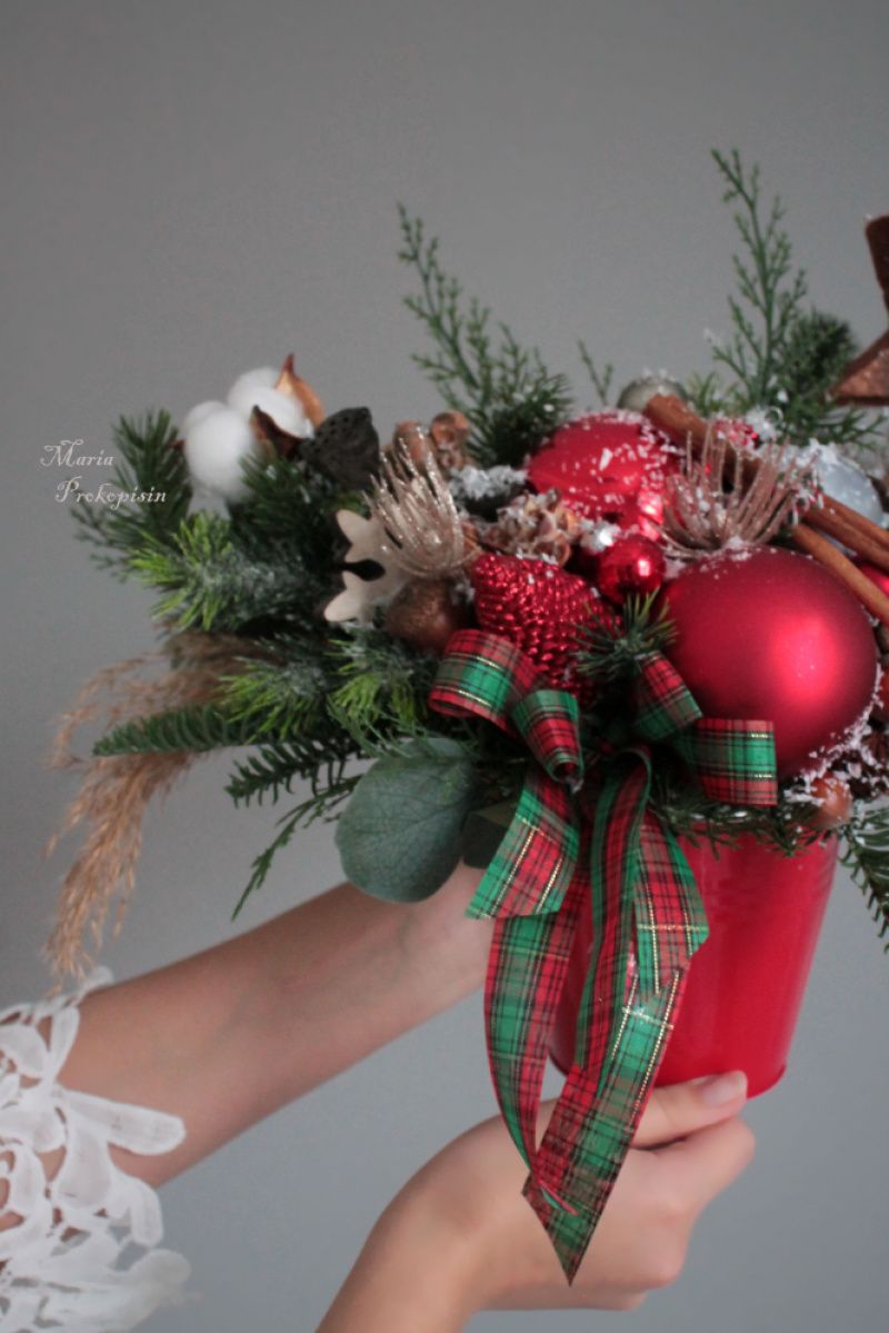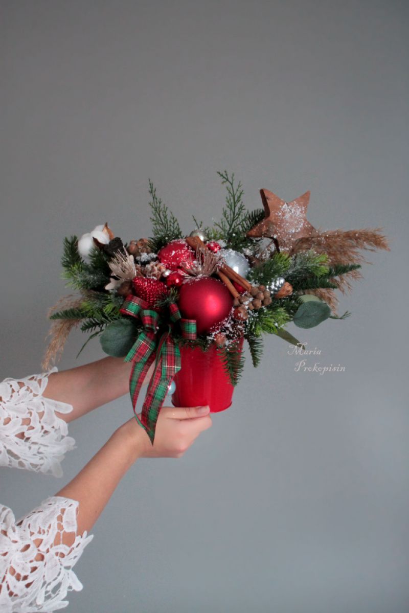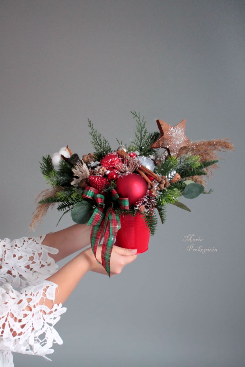 Новорічна пишна композиція в червоному кольорі-стане чудовою прикрасою для святкового столу,каміна чи кафе.
