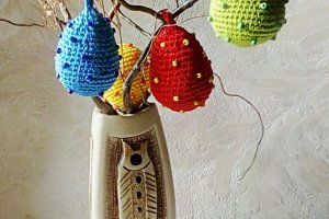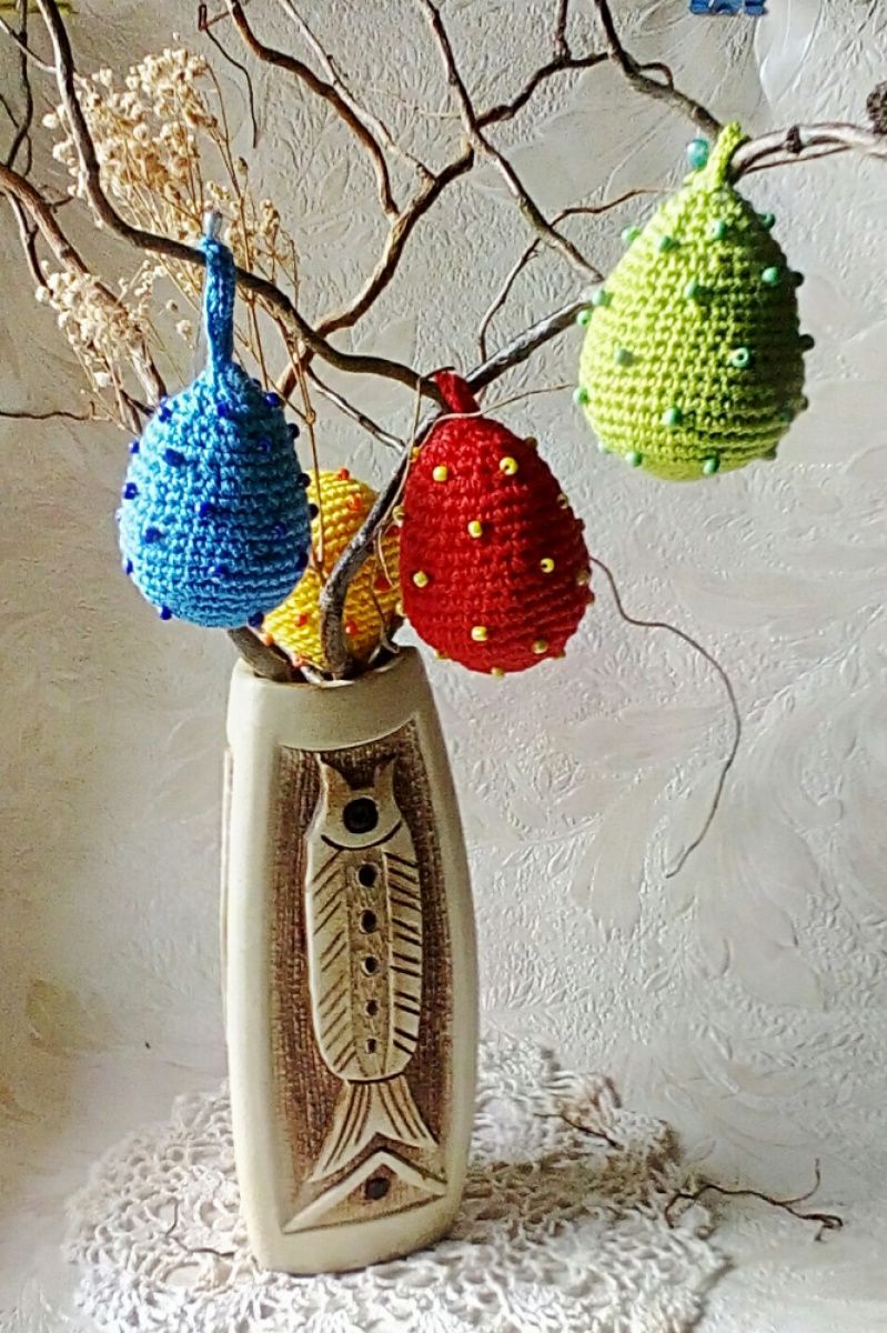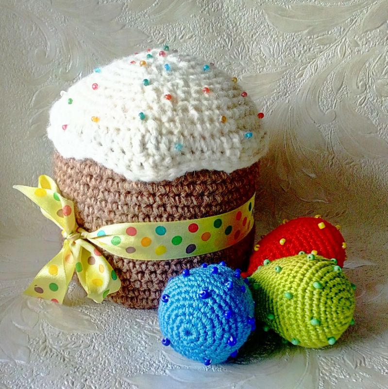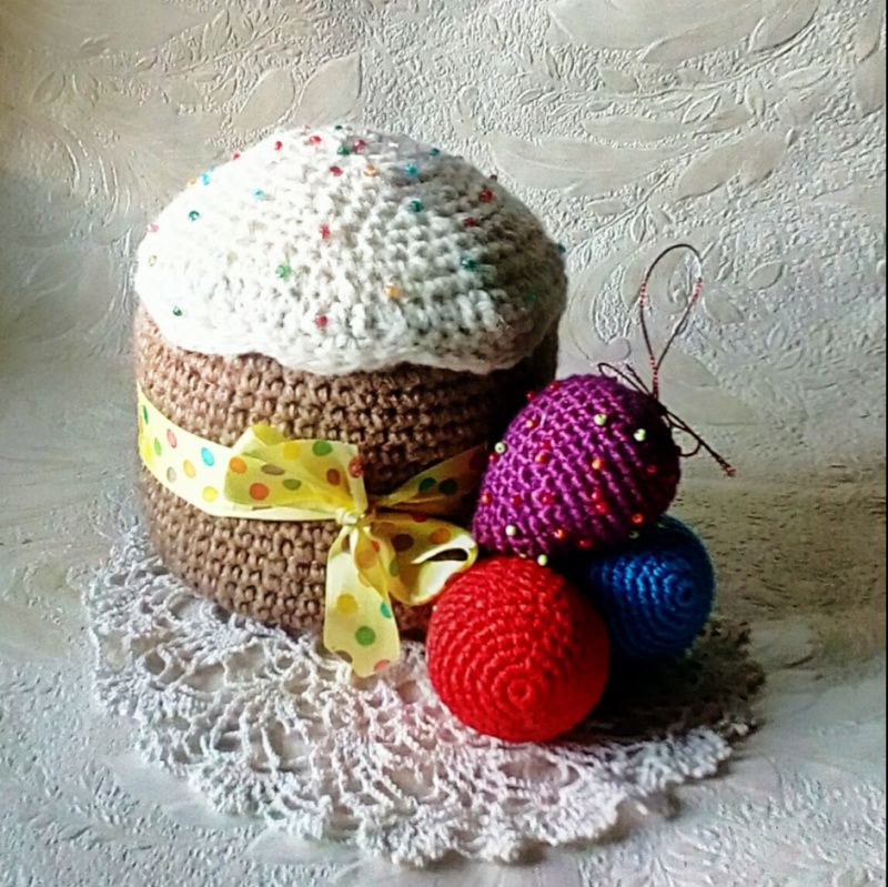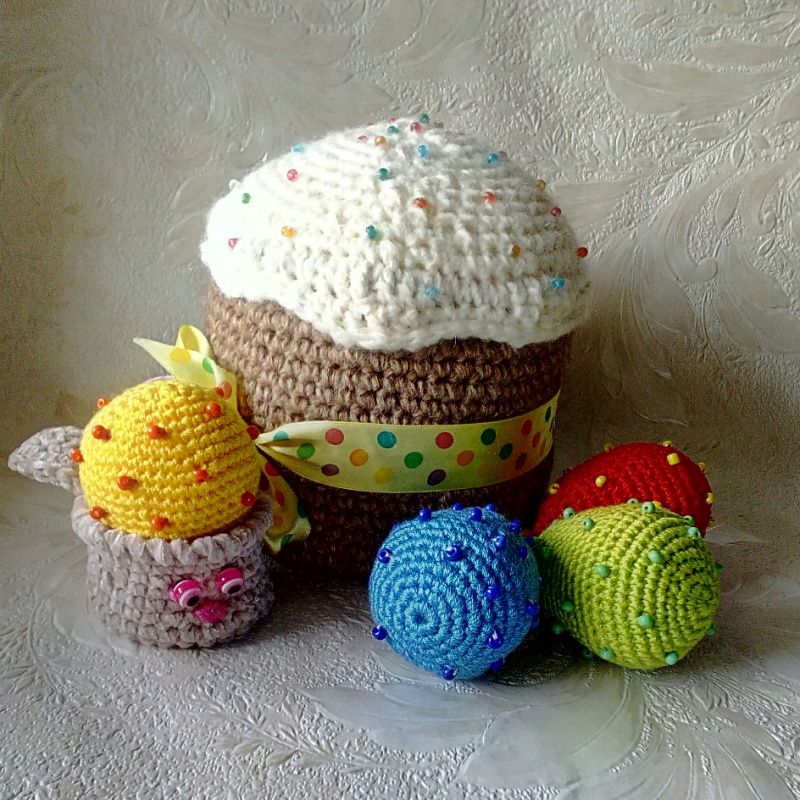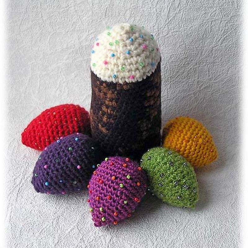 Паска і крашанки пов'язані гачком і декоровані бісером і намистинами, для святкового декору. Можуть послужити прекрасним подарунком в світле свято Паски, стане частинкою святкового декору, додасть нашому дому настрій головного свята православного церковного року, є спеціальним пасхальним сувеніром. Крашанки можна підвісити за шовкову стрічку або за петельку на вербну гілочку. Паска і крашанки святково прикрасять вам інтер'єр, створять атмосферу Світлого Воскресіння Христового. Можуть послужити прекрасним подарунком в світле свято Паска і крашанки стануть частинкою святкового декору, додадуть вашому дому настрій головного свята православного церковного календаря. Розмір великий паски - висота 15 см., Діаметр 14 см. Можна коригувати на замовлення розмір паски .. Крашанки розміром з яйце, в ціну входить 4 штуки. Можна придбати ці вироби окремо. При покупці набором ціна на 10% нижче