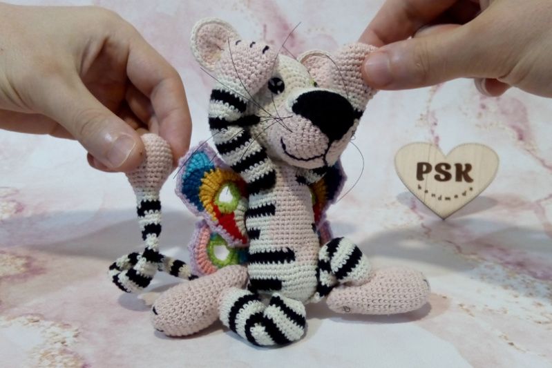 Білий тигр із крилами метелика та довгим хвостом. Авторська в'язана гачком інтер'єрна іграшка, символ року 2022. Чудовий подарунок дорослим і дітям за ціною виробника! ★ Опис: • 100% натуральна пряжа, бавовна і льон (тіло); • особливо стійка акрилова пряжа (крила, очі і вишивка); • рухливі кінцівки; • гіпоалергенний наповнювач холлофайбер; • без клею; все зшито вручну; • допустима прати у пральній машині на делікатних режимах; • матеріали, не схильні до линяння і вигорання на світлі; • широкі можливості персоналізації за окрему плату (вишивки ініціалів, виконання в інших кольорах та інше); • максимальне використання складових українського виробництва; • знижки і бонуси при замовленнях більше одного найменування і на наступні покупки (більше про це - в особистому листуванні); • фортеця вироби дозволяє безбоязненное інтенсивне використання - подорожі, ігри та інше.