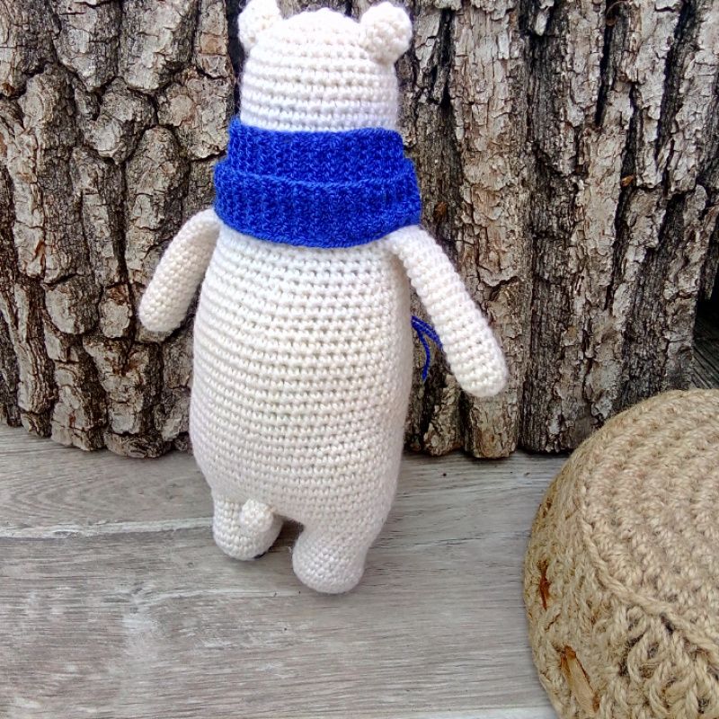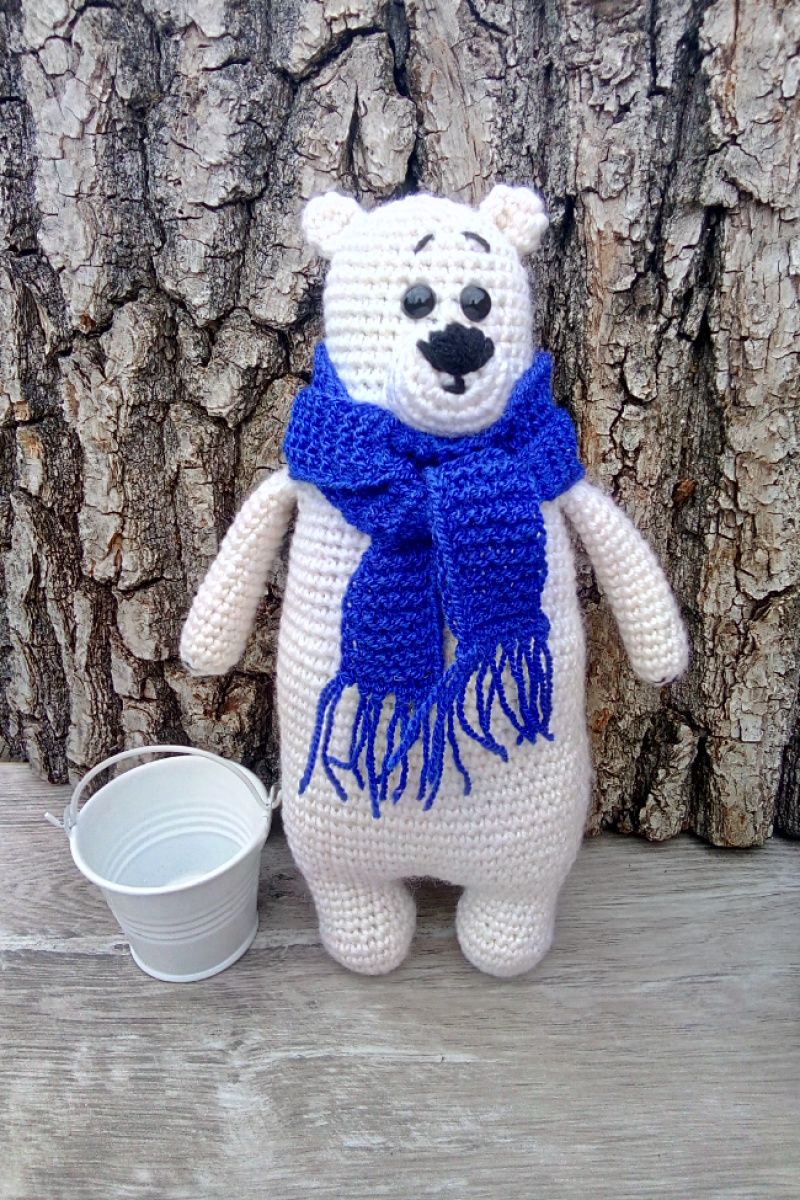 М"яка іграшка ведмедик. Оздоблена синім шарфом, що знімається. Очі на безпечному кріпленні.