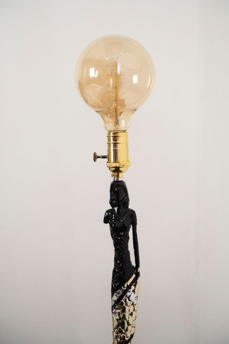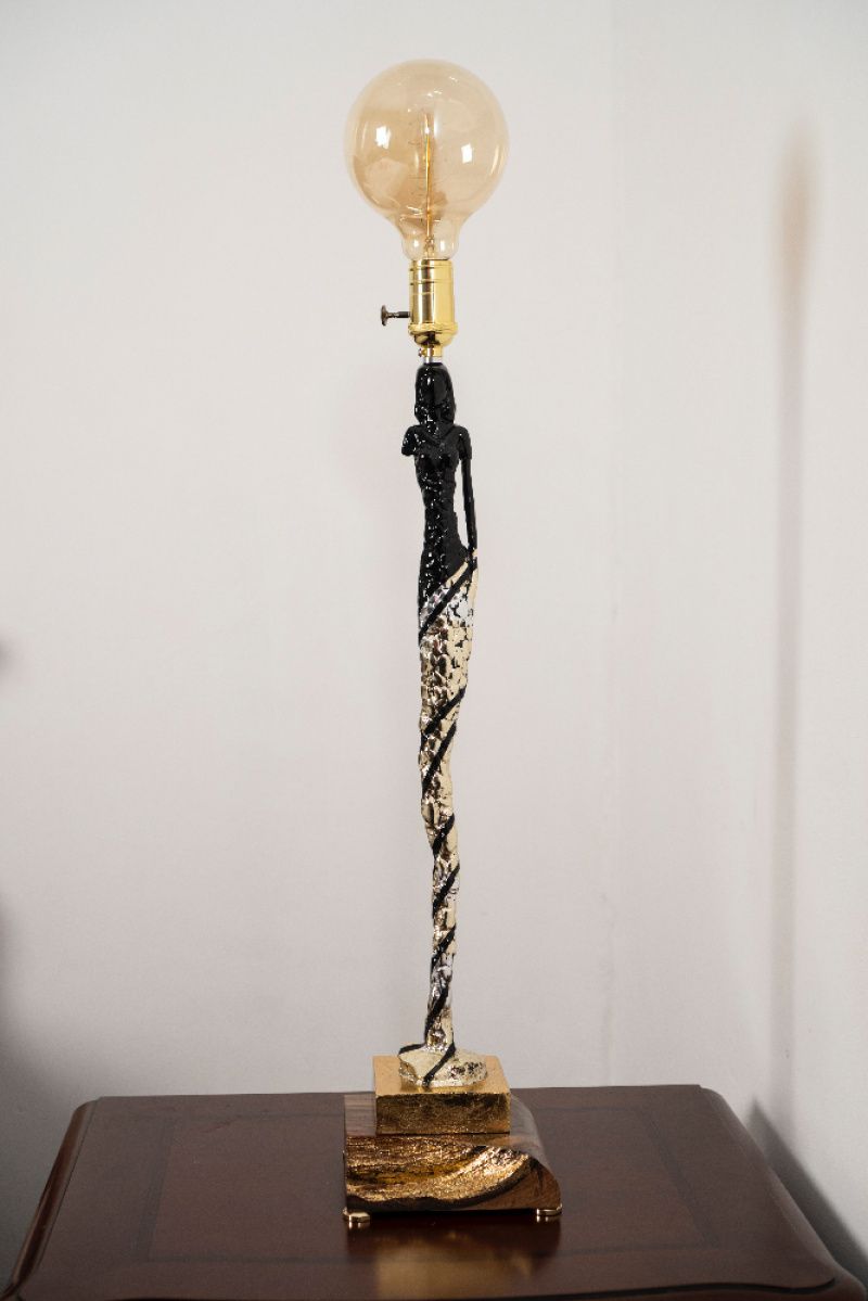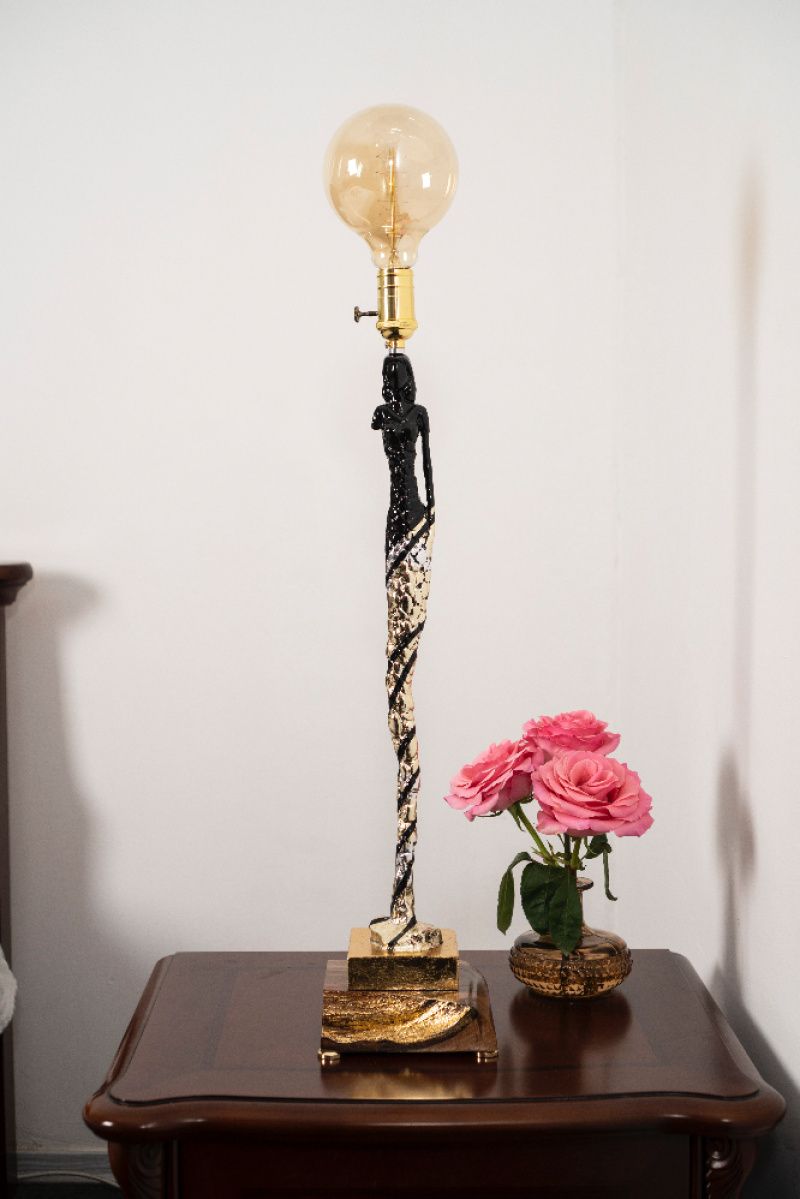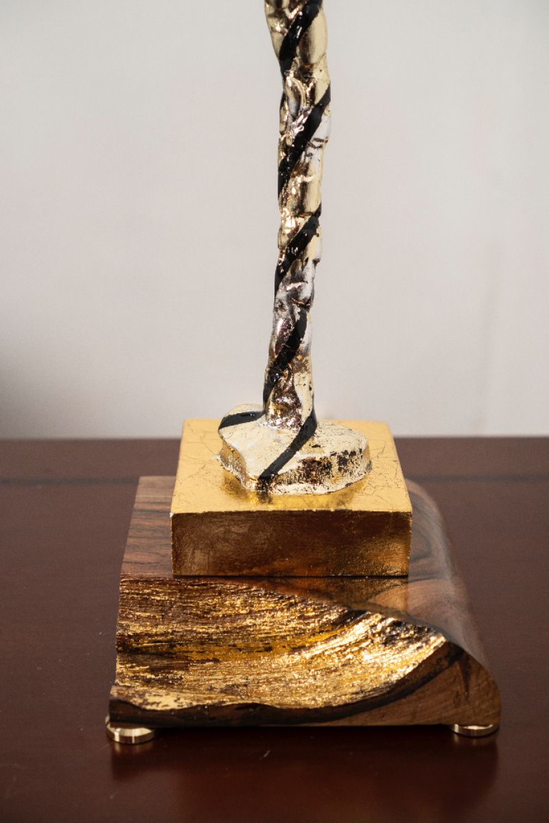 Світильник Pride&Joy, виготовлений із натурального дерева (горіха) та мінерально-полімерного матеріалу на металевому каркасі. Корпус оздоблений золотою та срібною поталью. Ручна робота з індивідуальним дизайном. Встановлено димер для регулювання яскравості світла на будь-який смак.