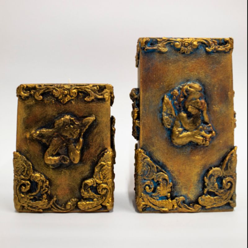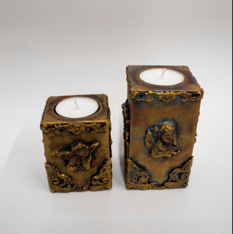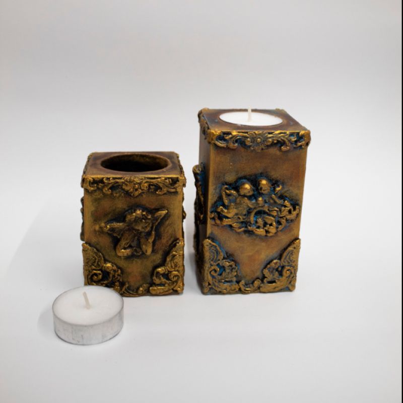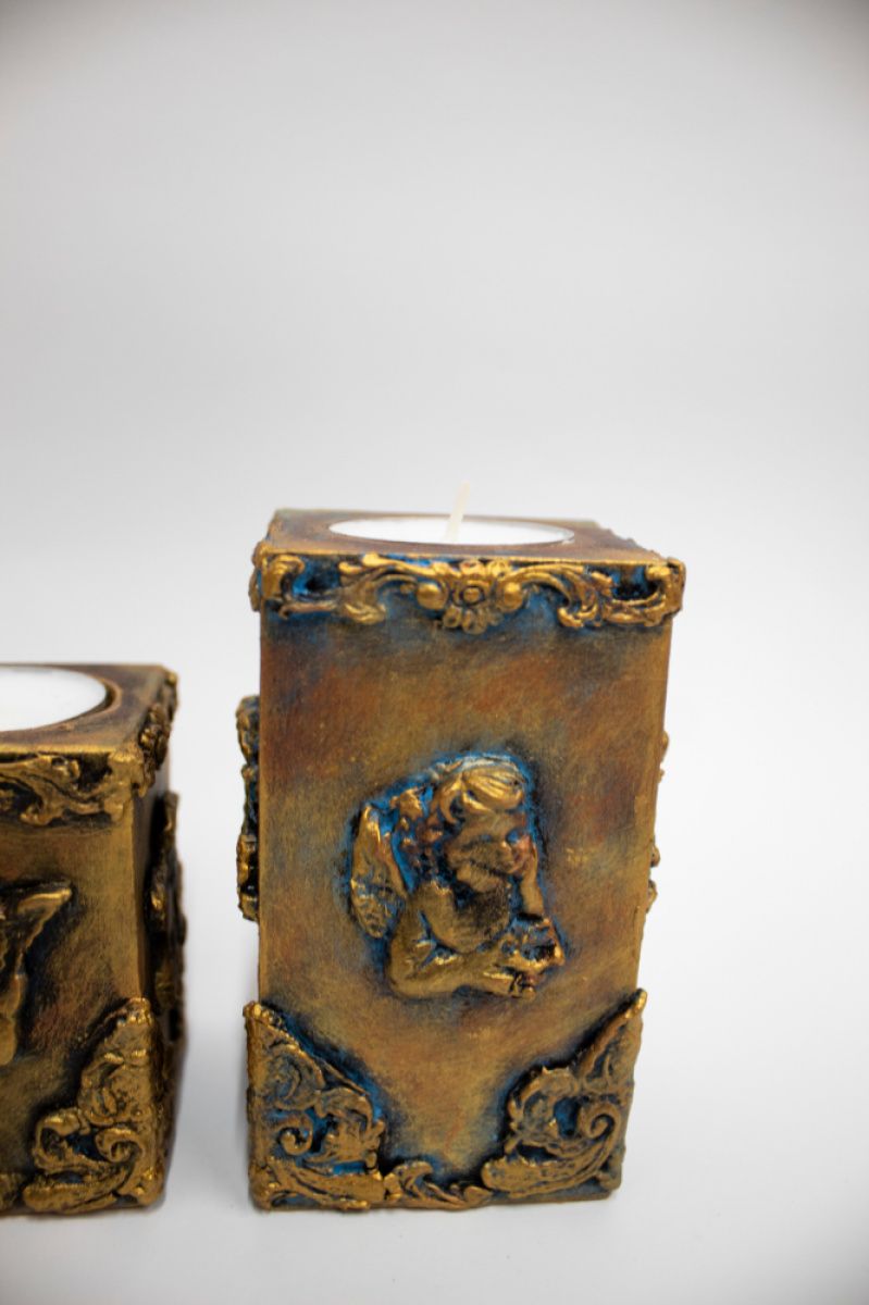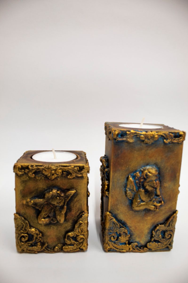 Декоративний набір підсвічників "Янголи", ручної роботи, виконаний із натурального дерева з використанням акрилових фарб, лаку, імітації металу та ліпнини.
