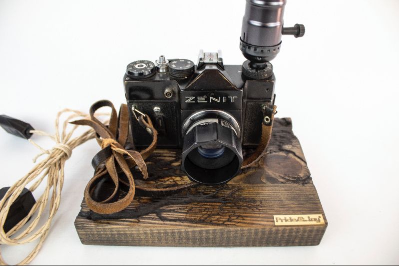 Настільна лампа Pride&Joy, виготовлена ​з натурального дерева, з фігурами Ліхтенберга, вінтажного фотоапарата та лампою Едісона. Ручна робота з індивідуальним дизайном. Встановлено димер для регулювання яскравості світла. на будь-який смак.