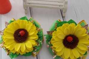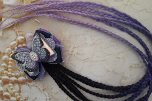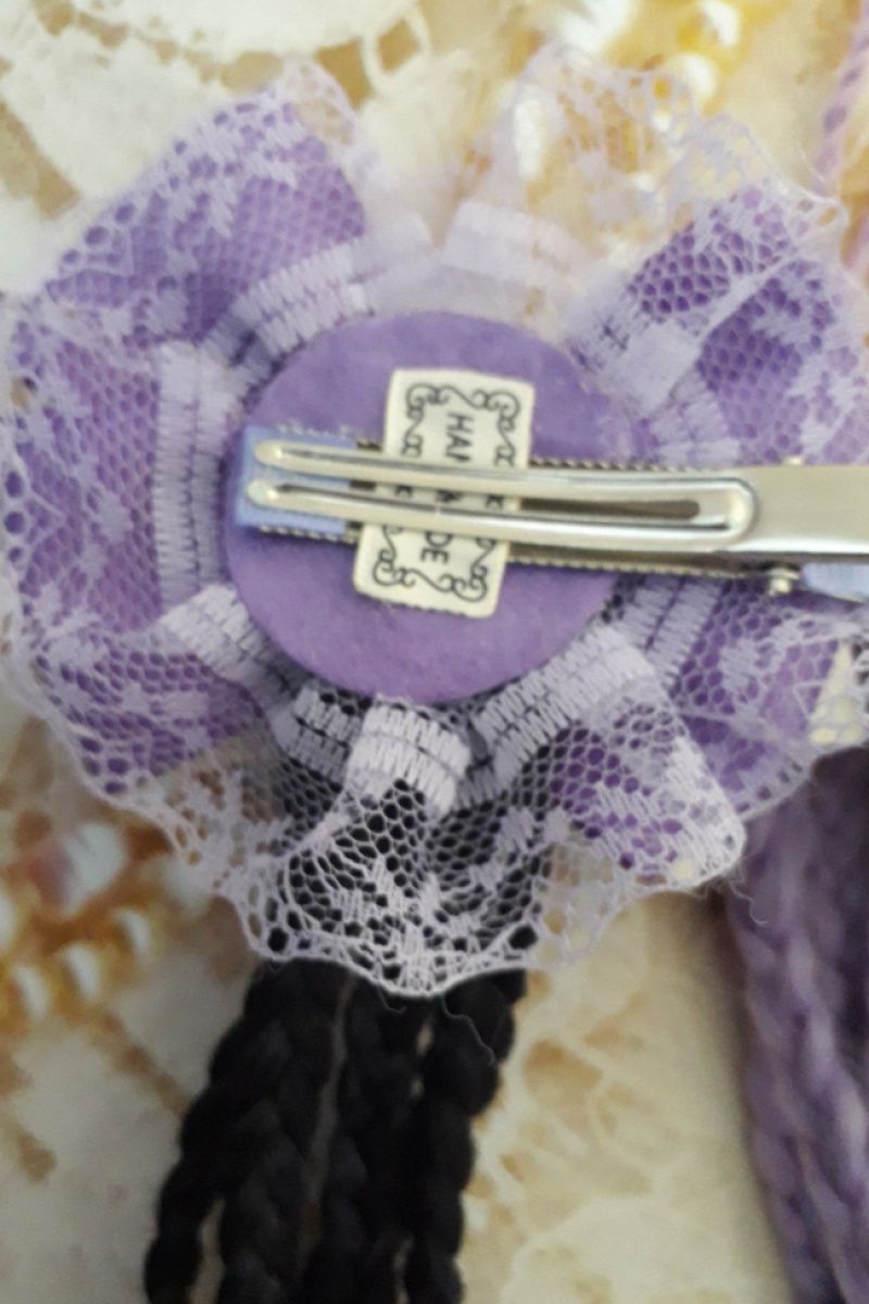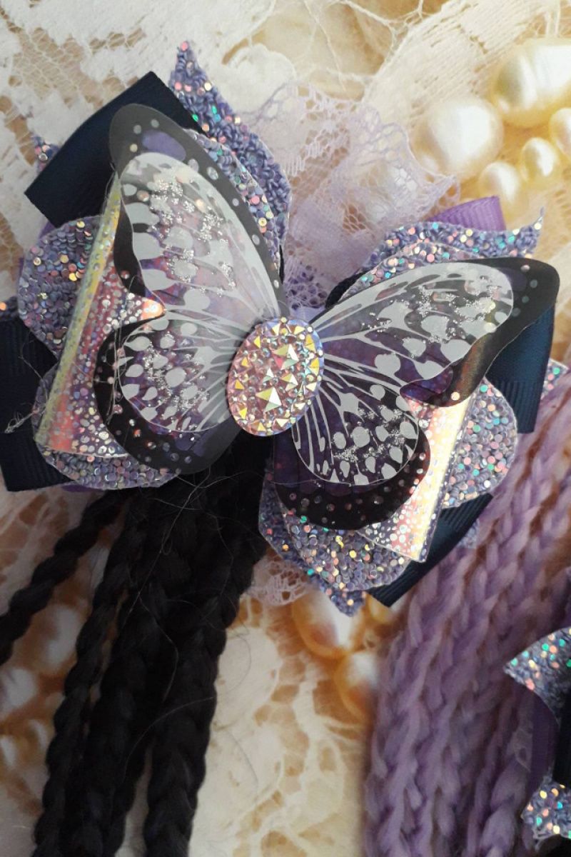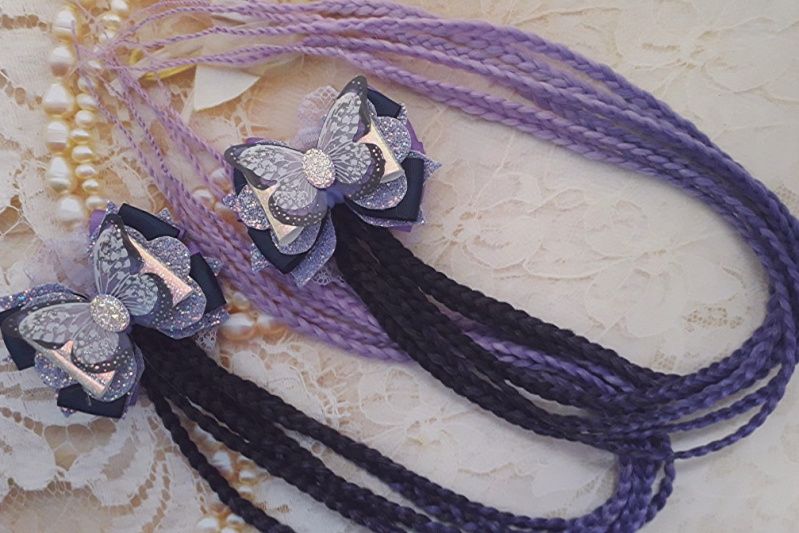 Бантики виконані з репсовою стрічки, мережива, екокожі з глитер. Прикрашені косичками з штучного волосся .Довжина кісок 60 см.