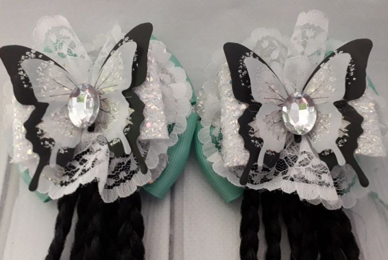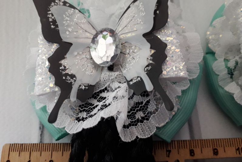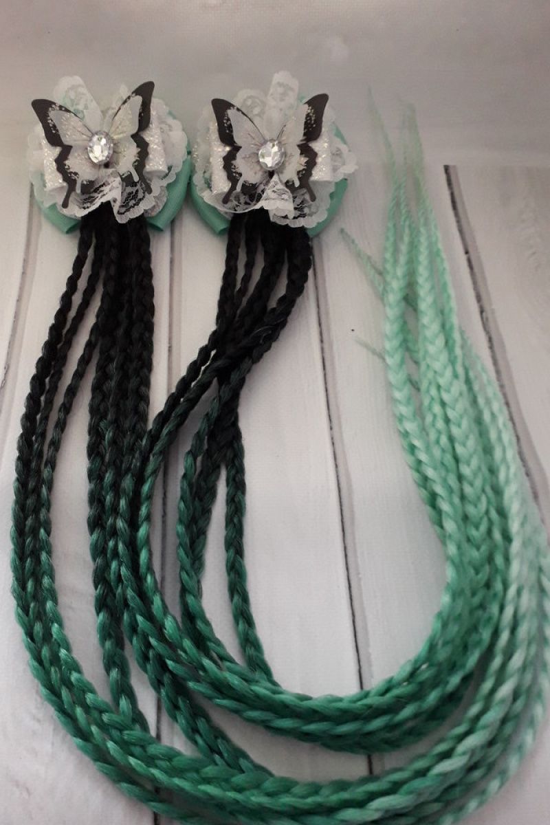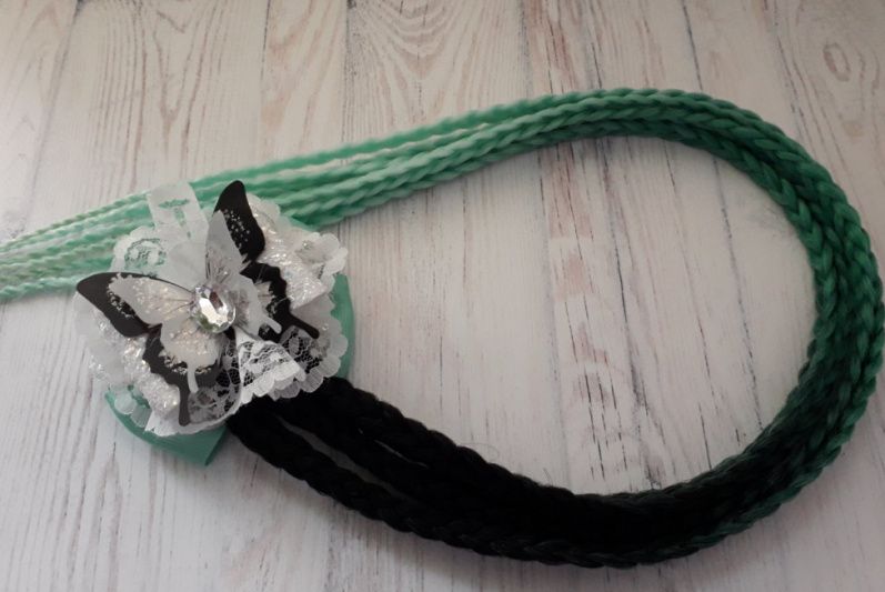 Бантики виконані з репсовою стрічки, мережива, екокожі з глитер. Прикрашені косичками зі штучних волосся Довжина кісок 60 см. Косички можна вплітати в коси ..