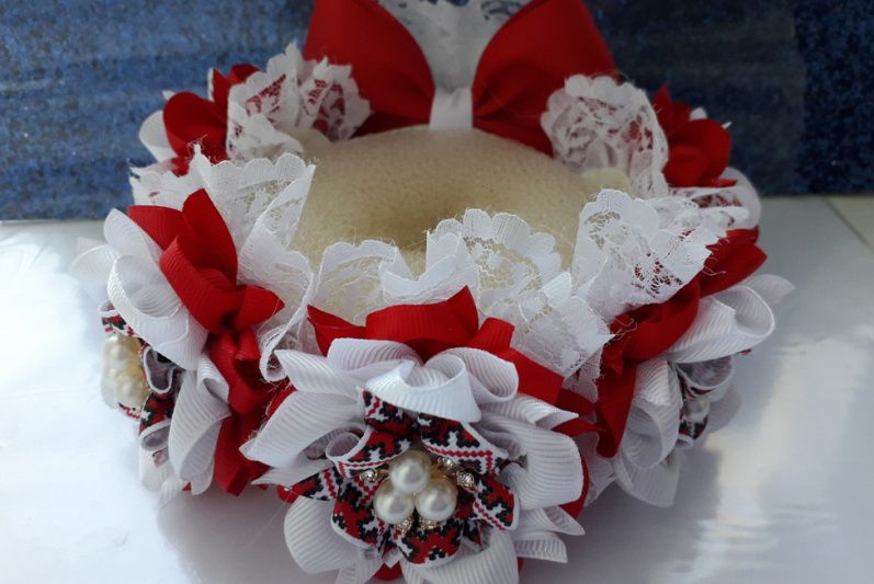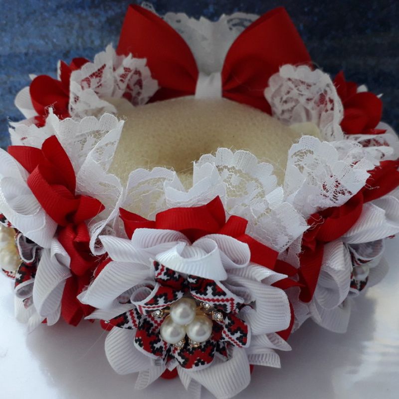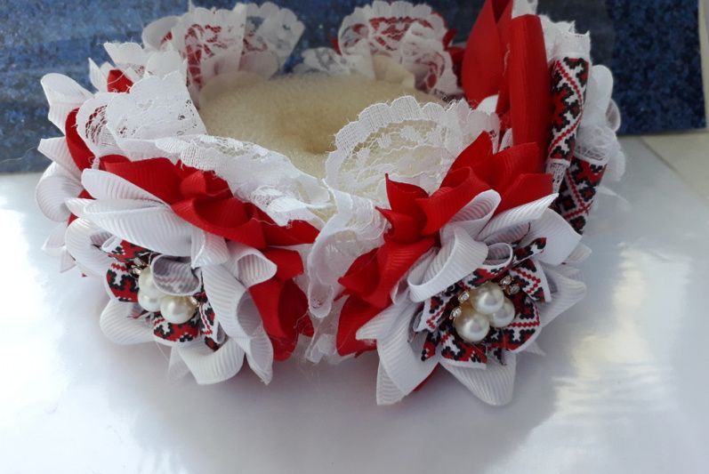 Прикраса на гульки виконано з репсовою стрічки і прикрашено мереживом і ювелірними серединками.