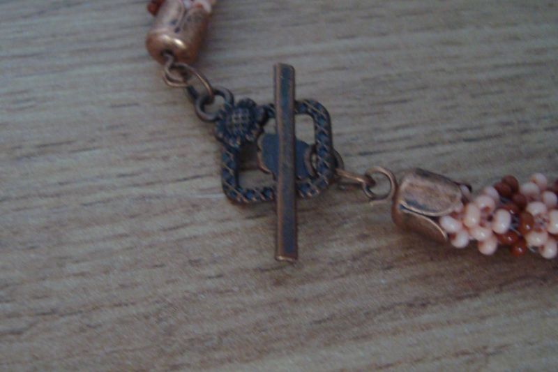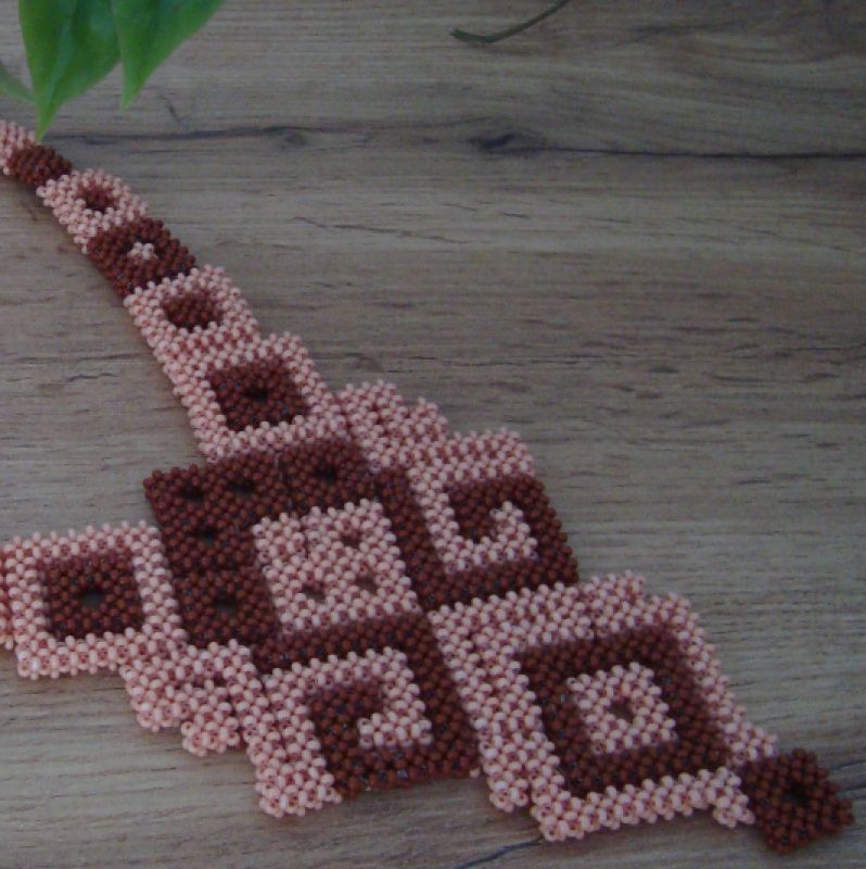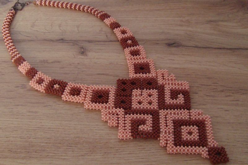 Кольє виконане у контрастних відтінках коричневого кольору з чеського бісеру. Высота центрального декоративного элемента 13 см