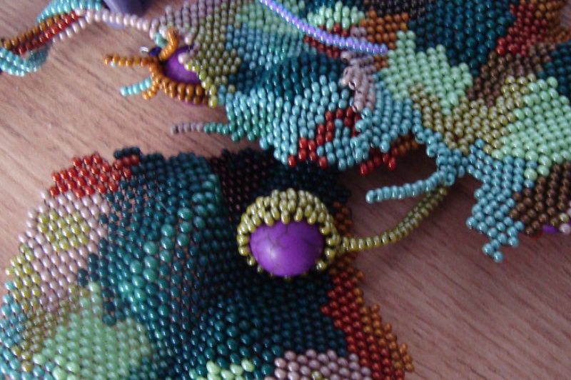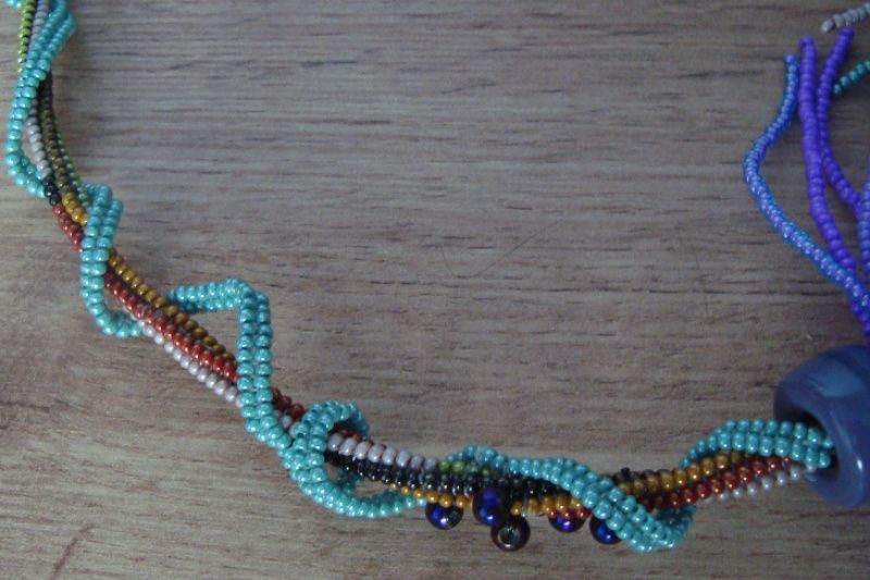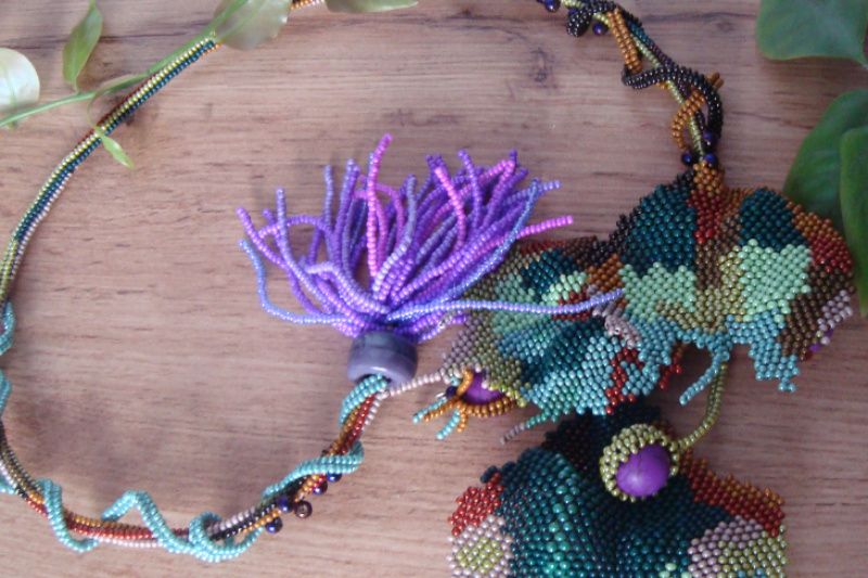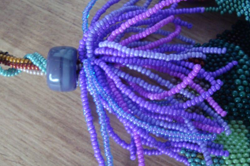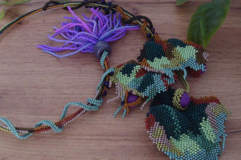 Кольє-чокер на меморі дроті з чеського бісеру (в т. ч. бісеру "люкс"), без застібки. Використані намистини натурального каменю та керамічна намистина на квітці.