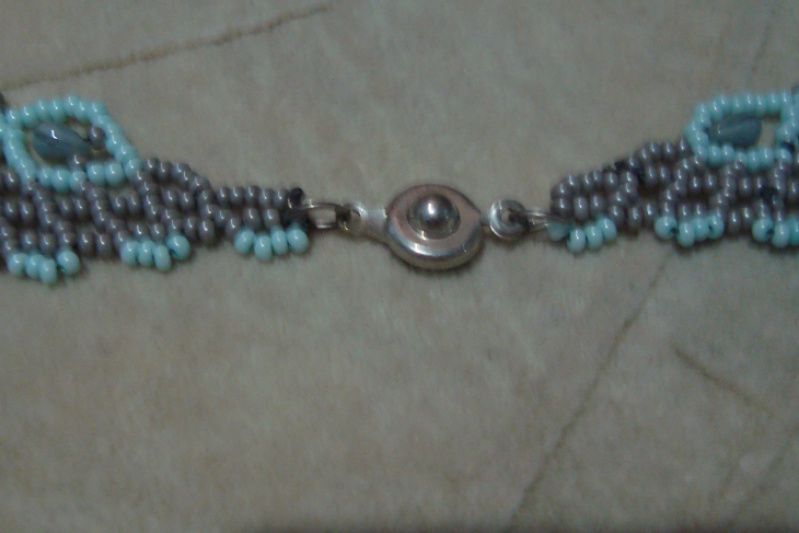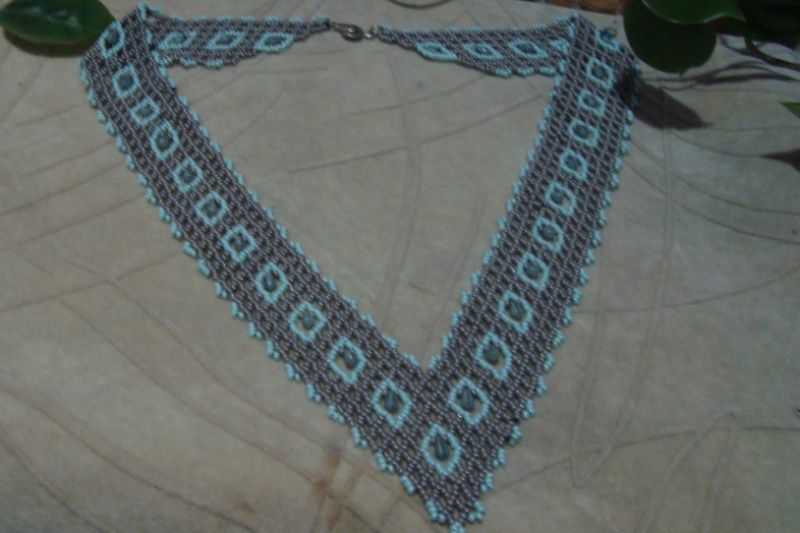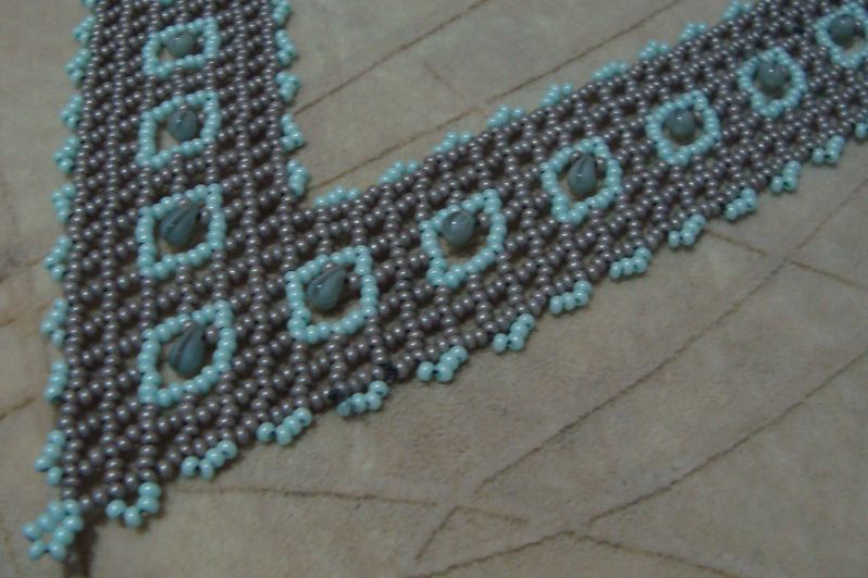 Кольє з чеського бісеру V-подібного силуету, у віконцях - намистинки-крапельки, металева застібка