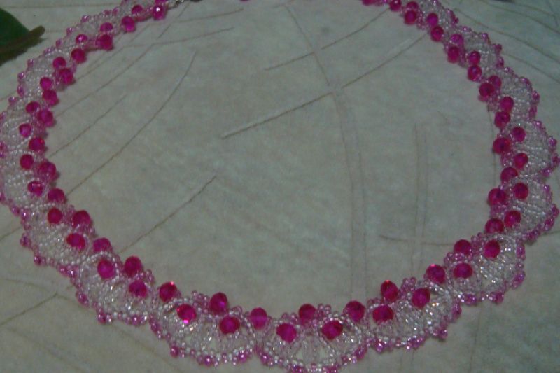 Ніжне біло-рожеве кольє з чеського бісеру з використанням кристалів-ронделів фуксиєвого кольору, замочок - магніт.