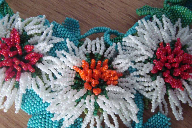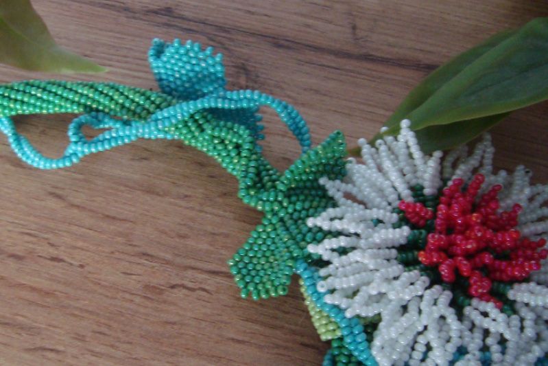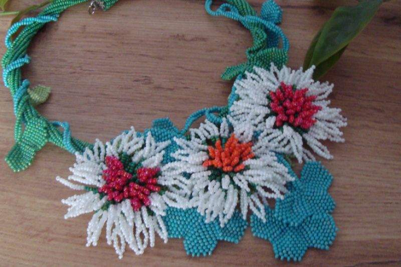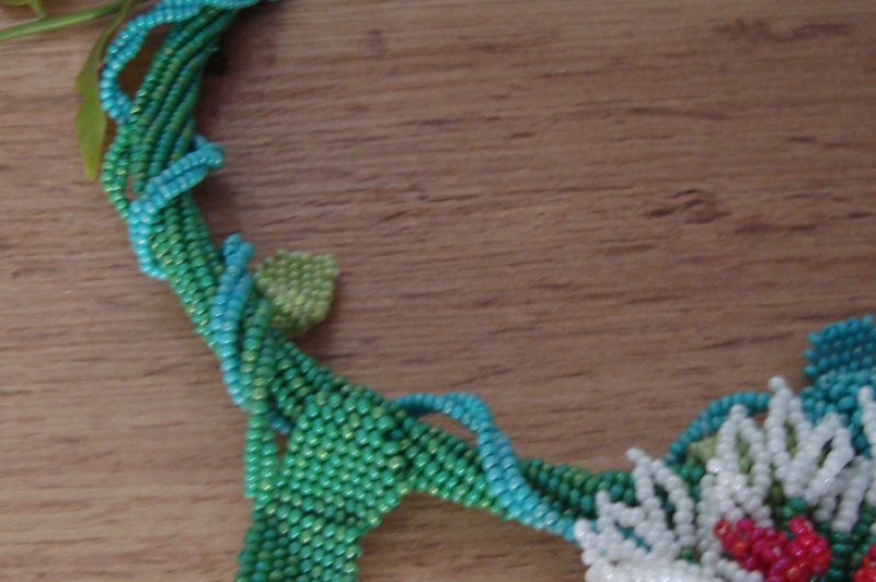 Кольє на меморі дроті із джгута та бісерної ажурної сітки, декорованої плетеними квітами та листям, замок-карабін