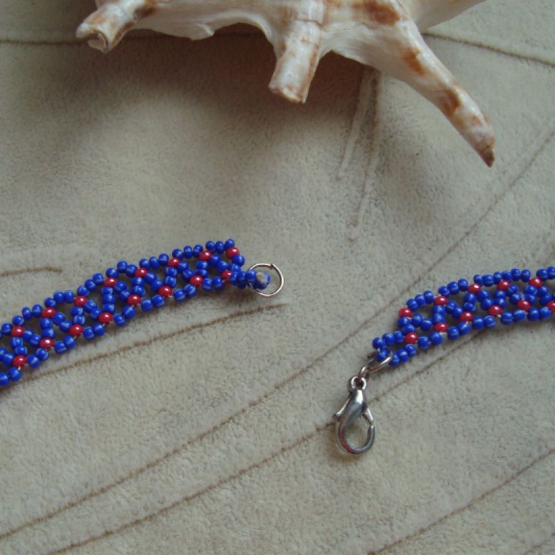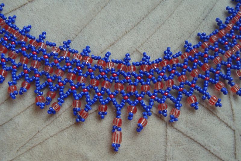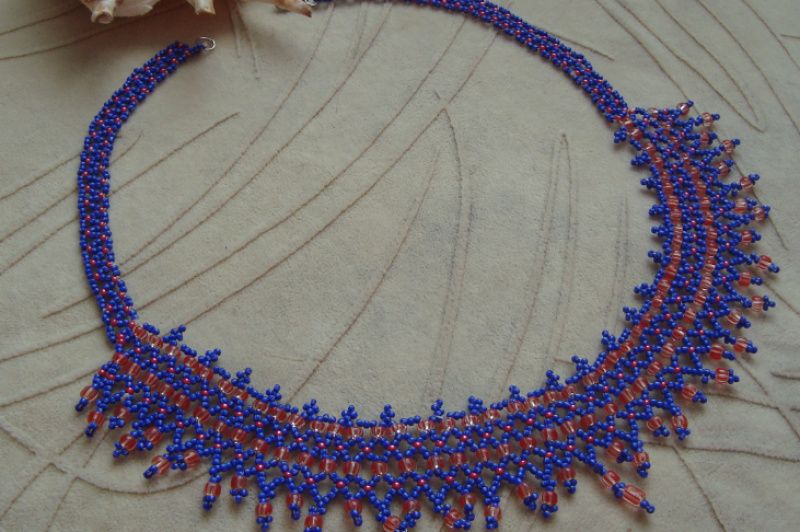 Бісерне кольє виконане у вигляді сітки з синього чеського бісеру з додаванням контрастного бісеру більшого розміру, застібка - карабін