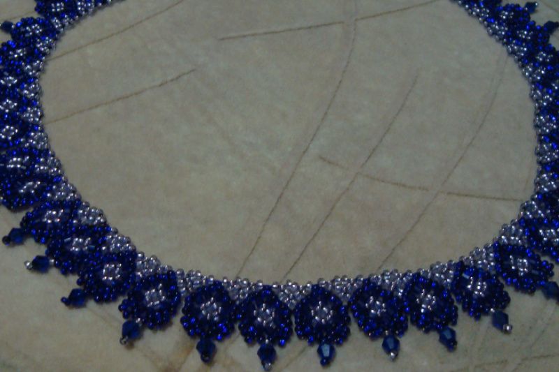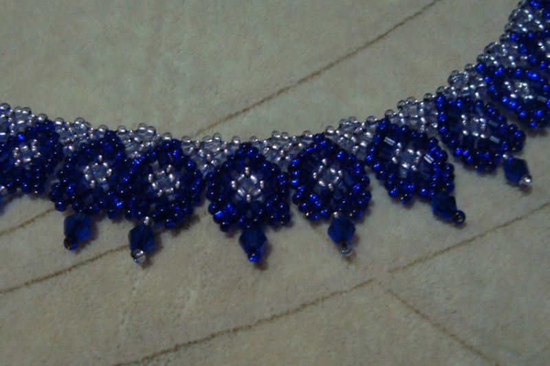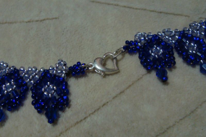 Гарне кольє з чеського бісеру "вогник" та скляних біконусів у королівському кольорі: синьому та срібному, застібка карабін-сердечко