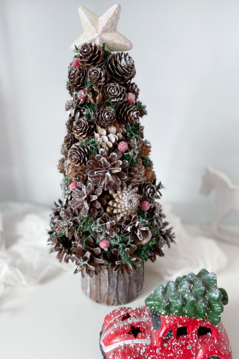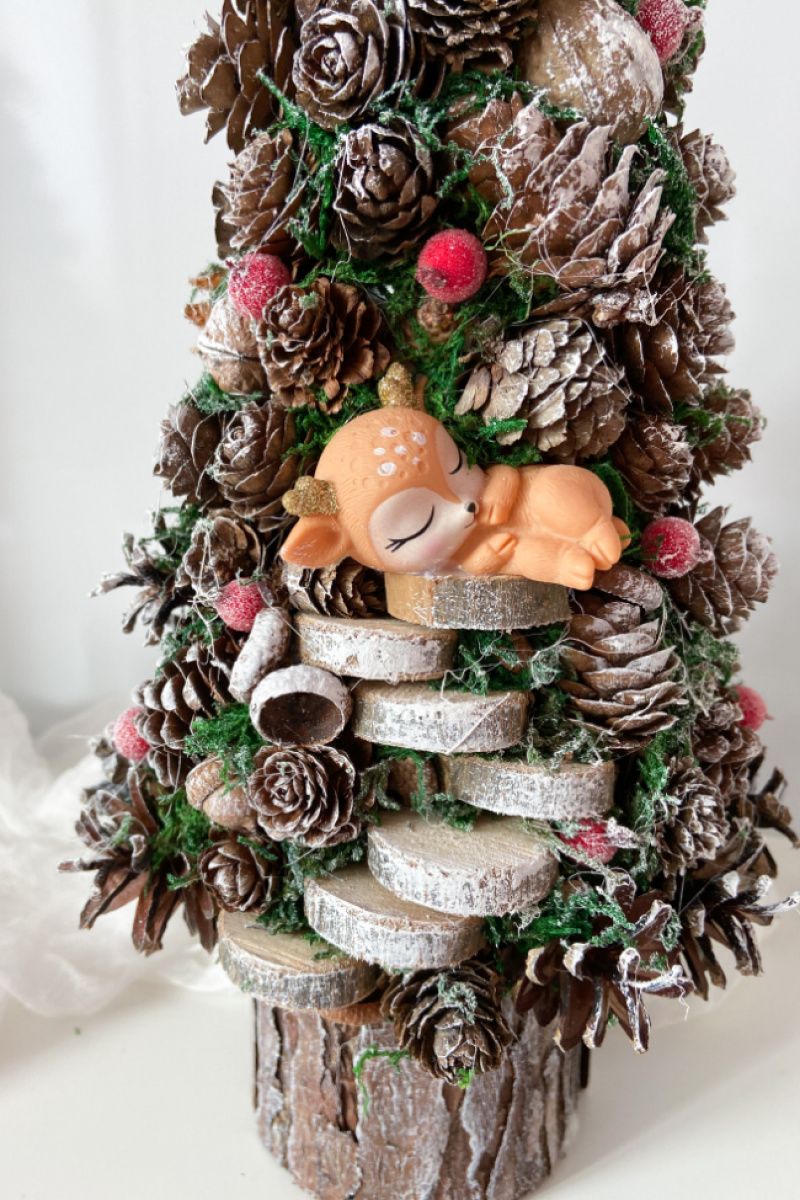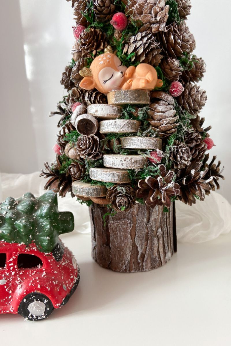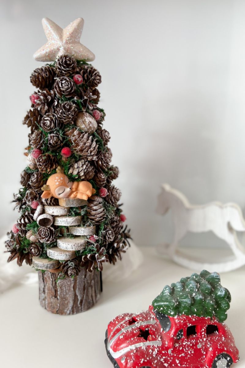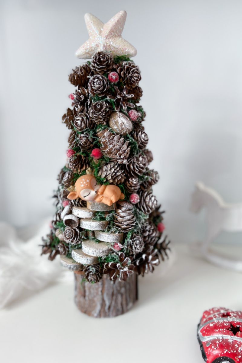 Ялинка має 39х19 см . Зроблена з шишок,горіхі,жолудів,моху,зрізи,олень. Зверху зірка-пластик. Стоїть в горщику з дерева (кора).