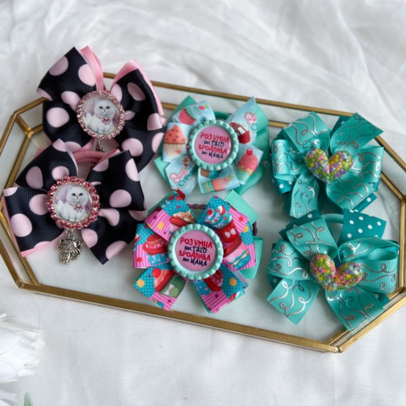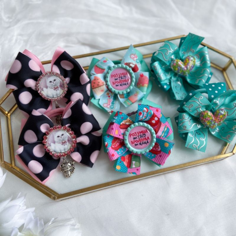 Неймовірний наборчик з резиночок зроблять щасливу Вашу дівчинку. Бантики зроблені з репсових стрічок.Мають два слої,кріпляться на резинку. Прикрашені акриловими планерами і різним декором. Ціна вказана за набір. Розмір бантика 9 і 7 см.