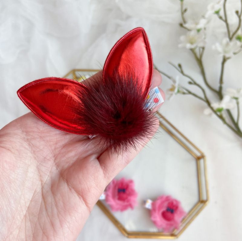 Червоні вушка- екошкіра з натуральним норковим помпоном-заколка.