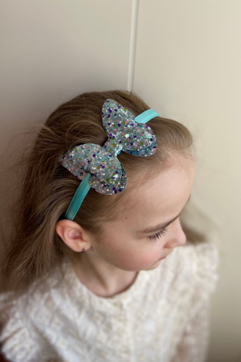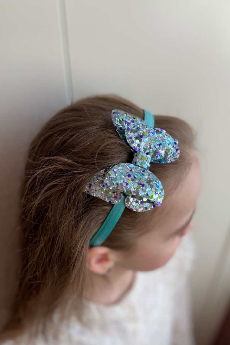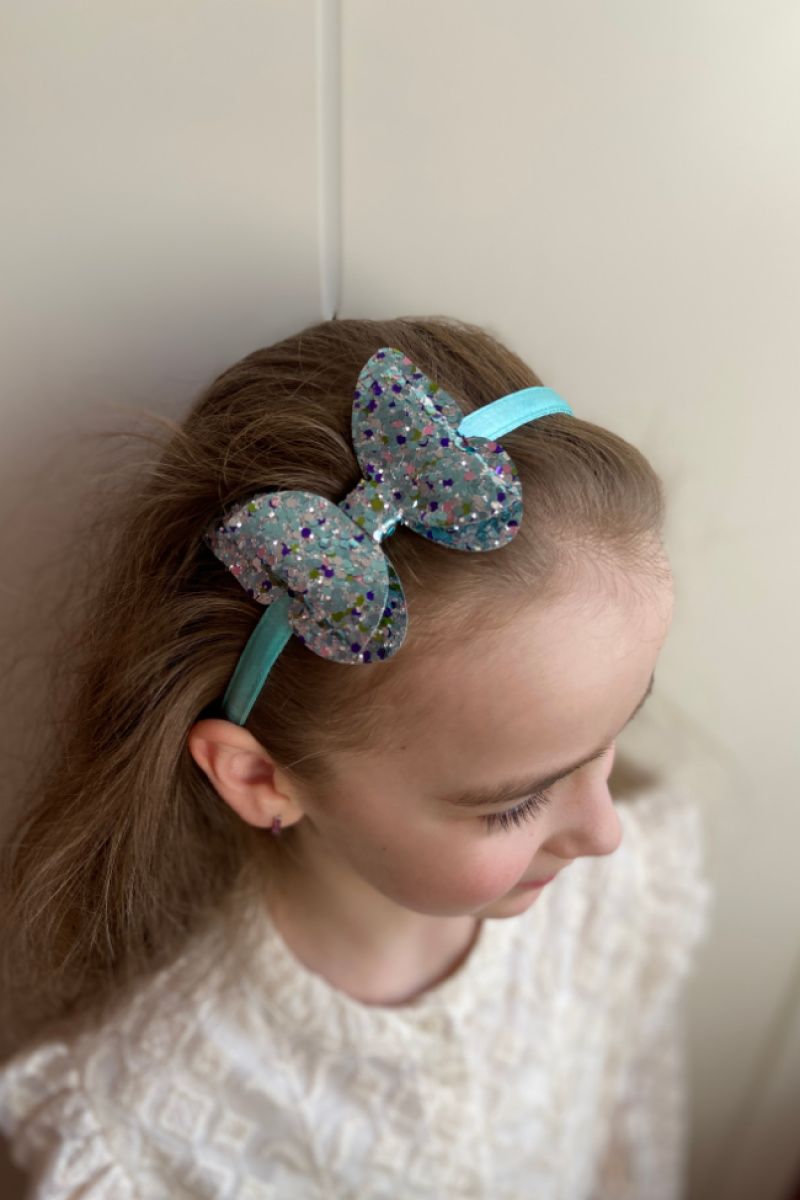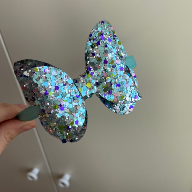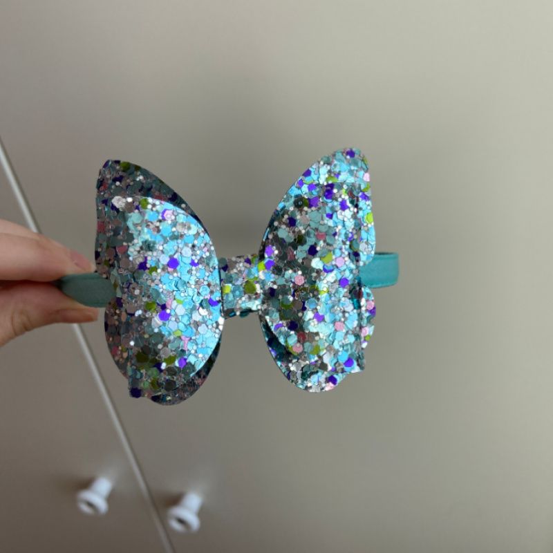 Одночас нарядний і мінімалістичний обруч.Метелик-бантик зроблений глітерної екошкіри,яка гарно виблискує на світлі.Основа-обруч металевий обшитий тканиною.