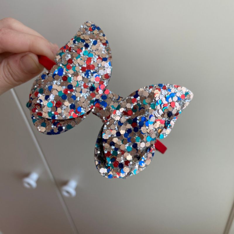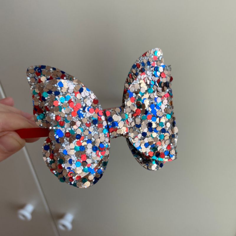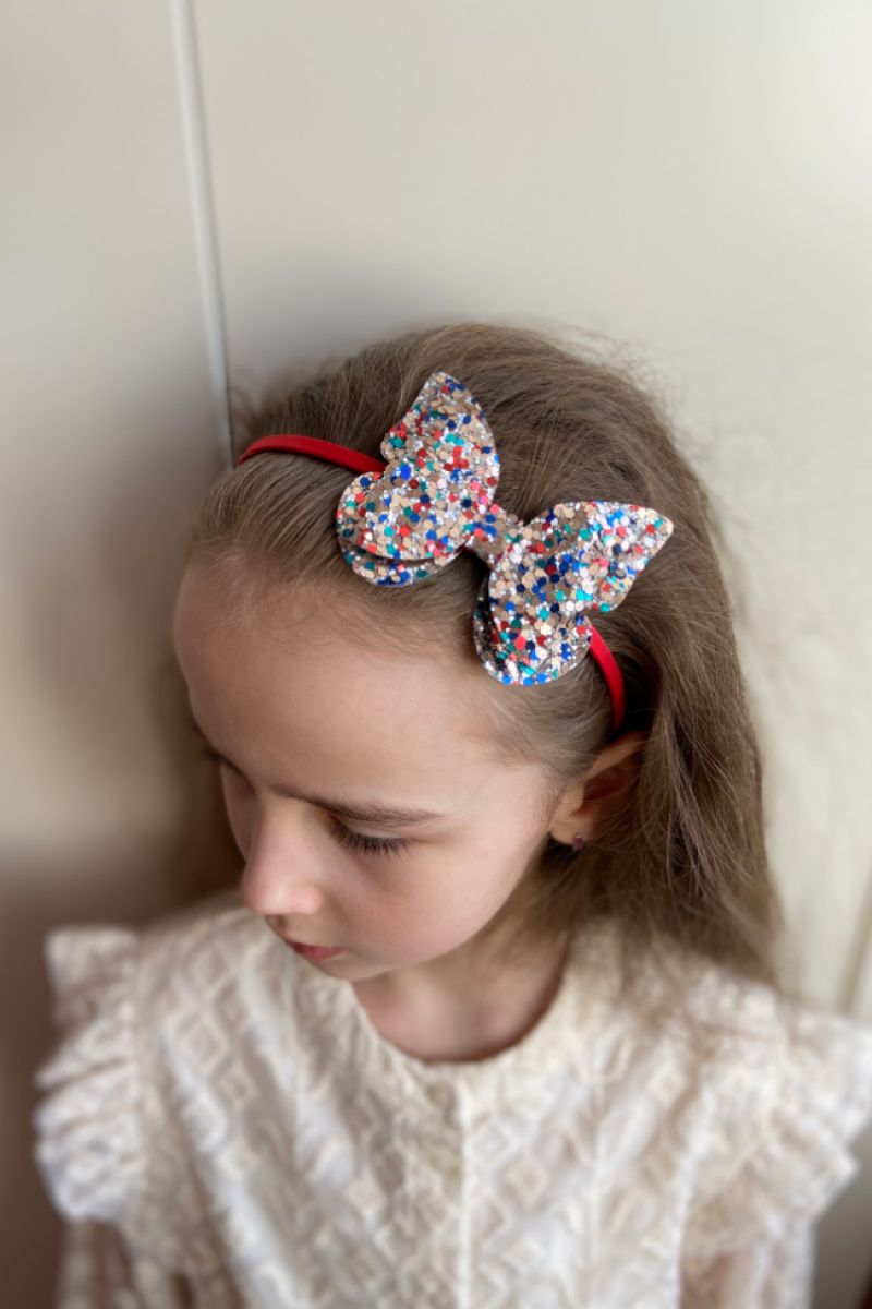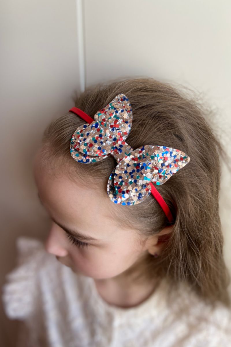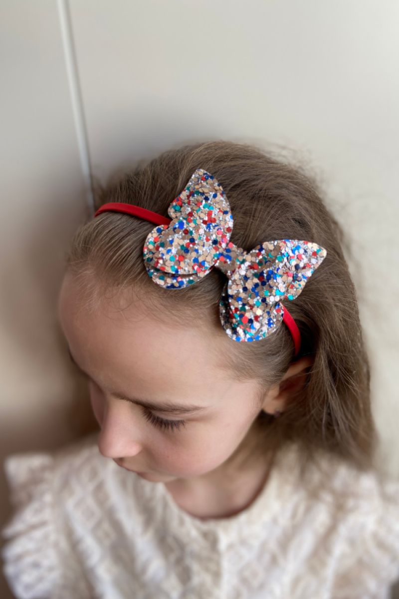 Одночас нарядний і мінімалістичний обруч.Метелик-бантик зроблений глітерної екошкіри,яка гарно виблискує на світлі.Основа-обруч металевий обшитий тканиною.
