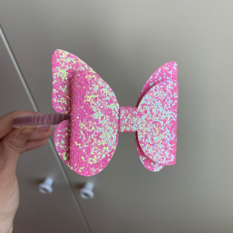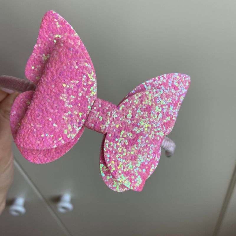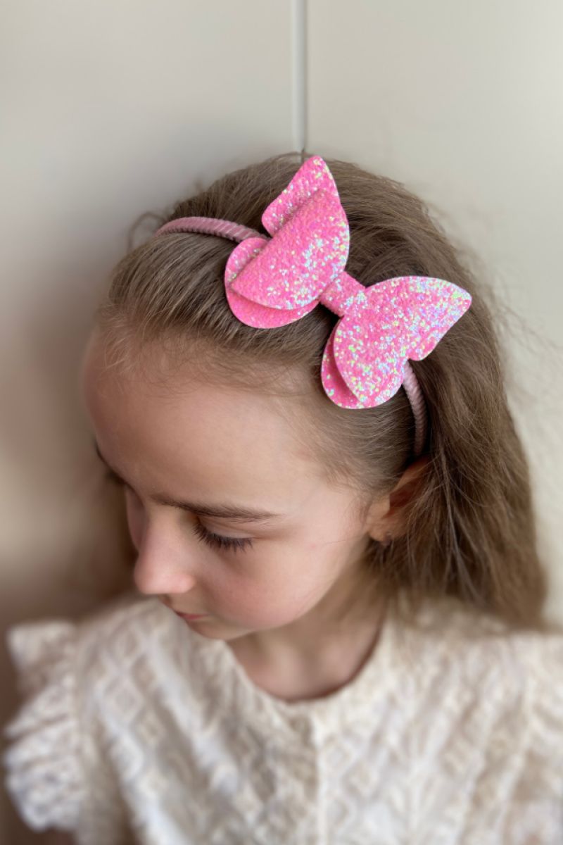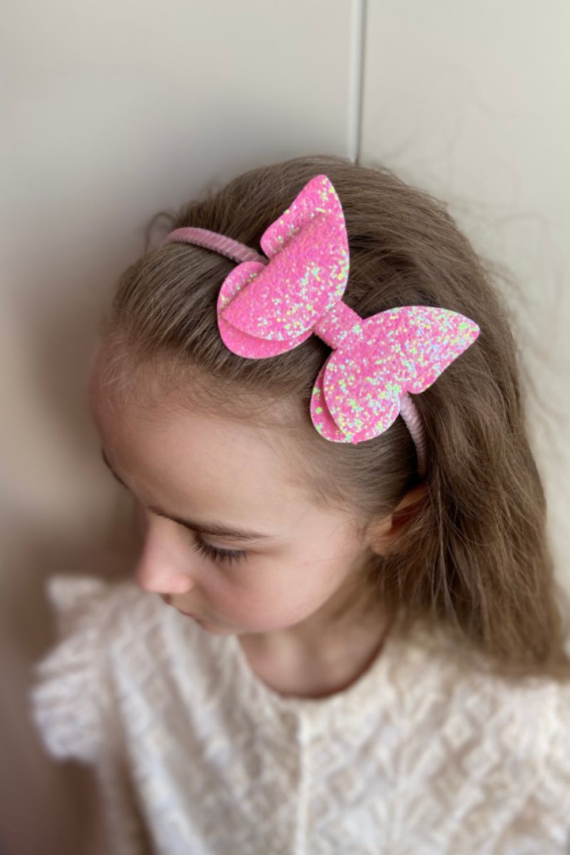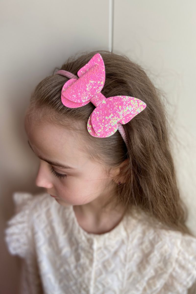 Одночас нарядний і мінімалістичний обруч.Метелик-бантик зроблений глітерної екошкіри,яка гарно виблискує на світлі.Основа-обруч металевий обшитий тканиною.