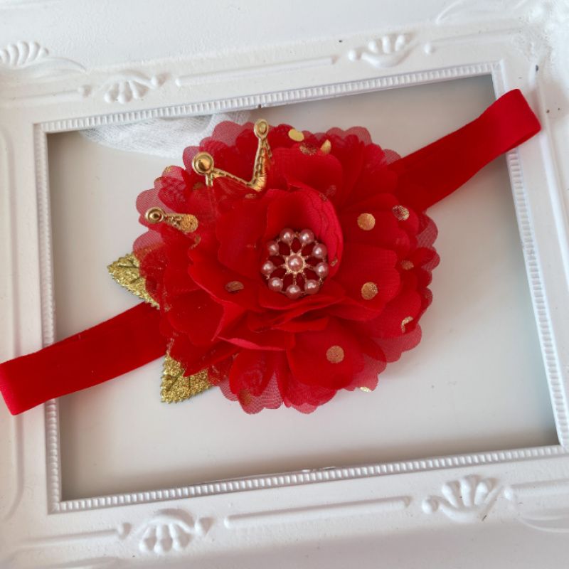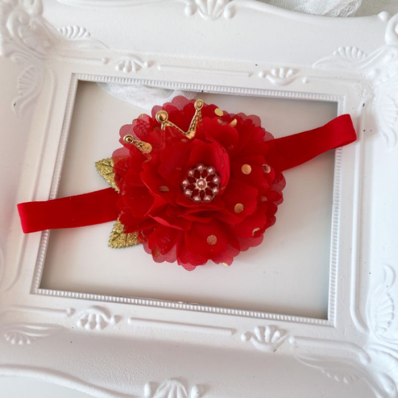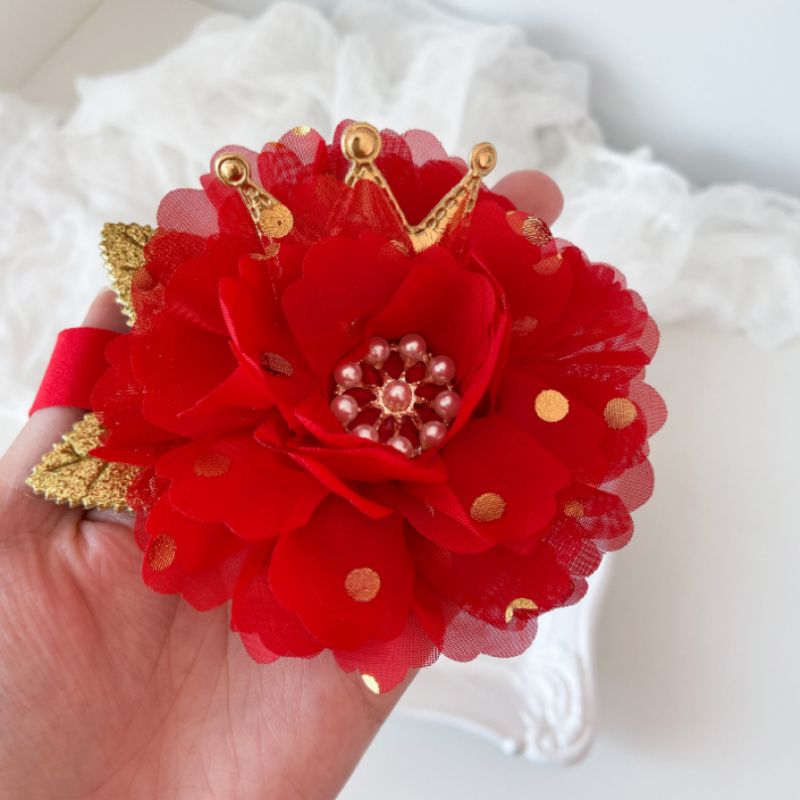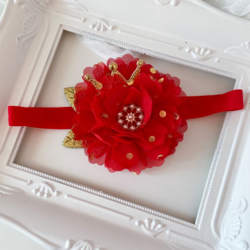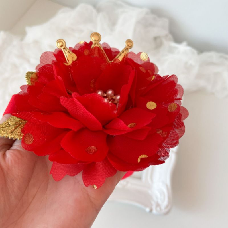 Квітка зроблена з тканини. Прикрашена стразовою серединкою,листочками,короною та бантом. Розмір композиції 15х10см. Основа еластична резинка, яка гарно тягнеться.