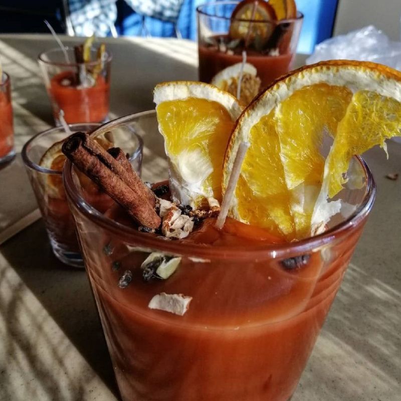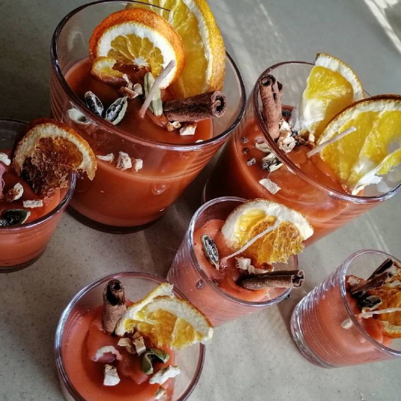 Свічка з ароматом глінтвейну. Декор натурального походження: - висушені апельсини - палички кориці - висушена цедра мандарину - кардамон - бадьян