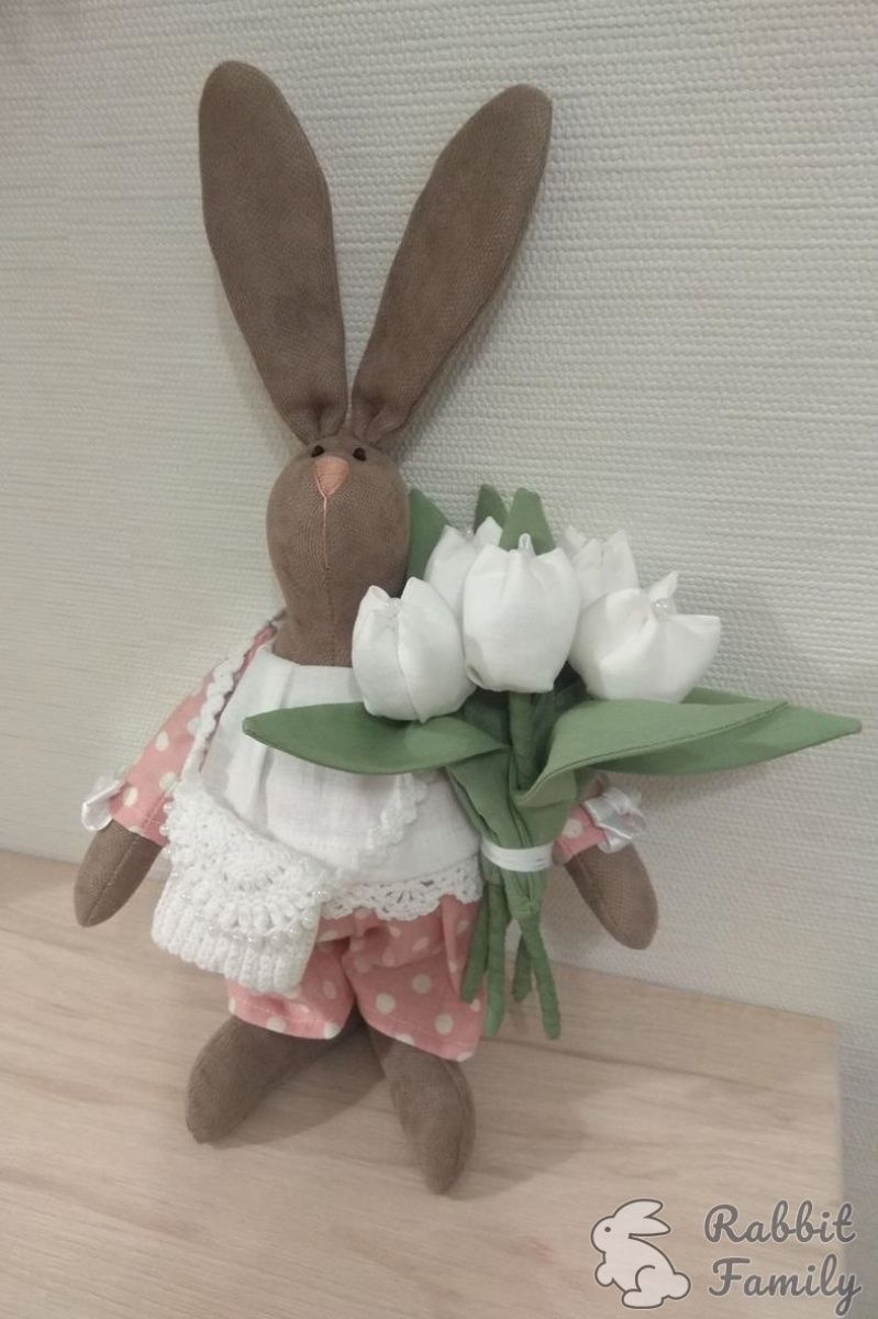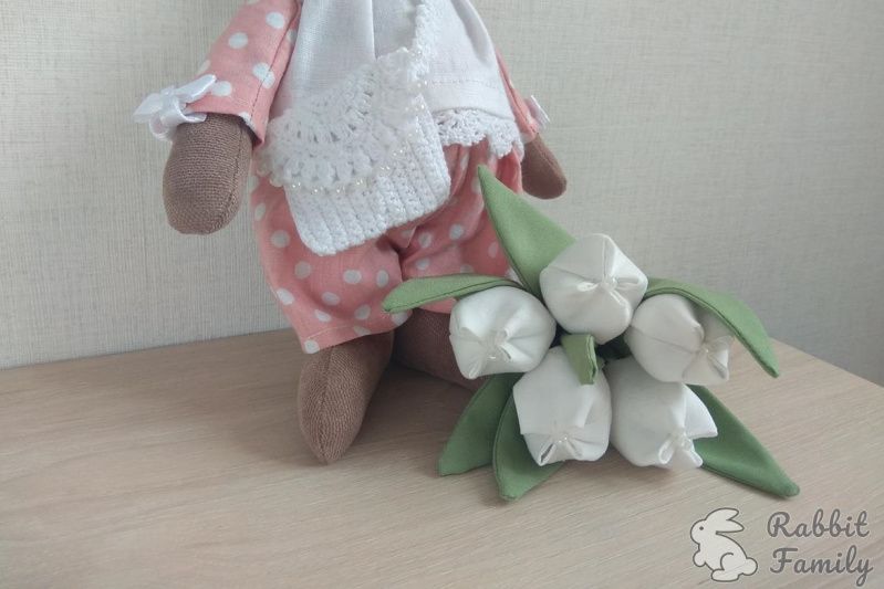 За вашим бажанням зайчик при переїзді до вас може мати при собі такі аксесуари, як пишна квітка на шию, букет квітів, модна в'язана сумочка або навіть маленький приятель (зайчик або ведмедик). Колір зайчика, одягу та аксесуарів може бути обраний на ваш смак.