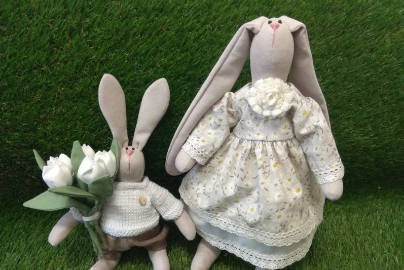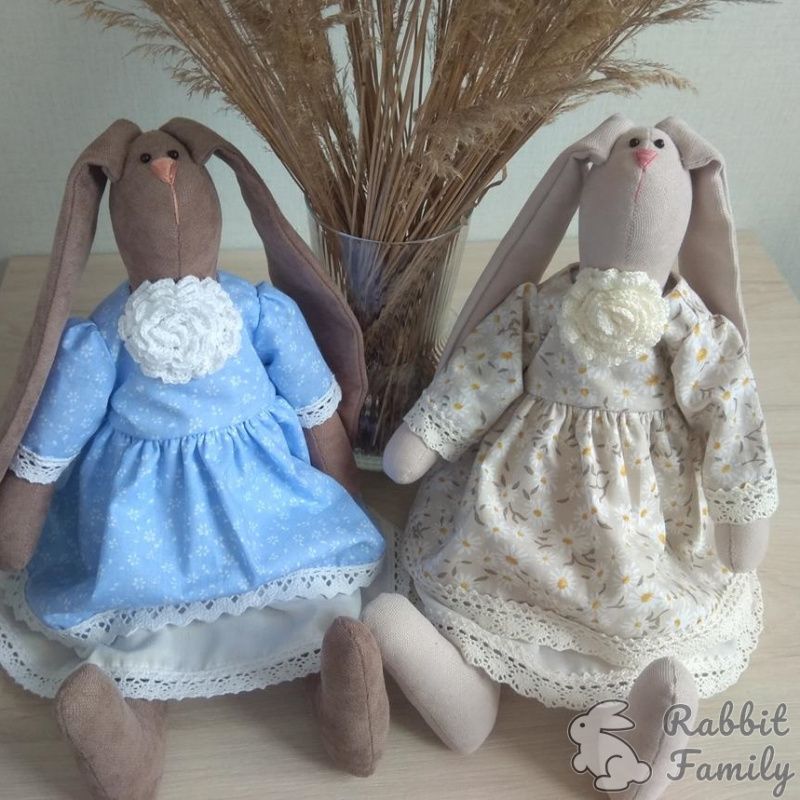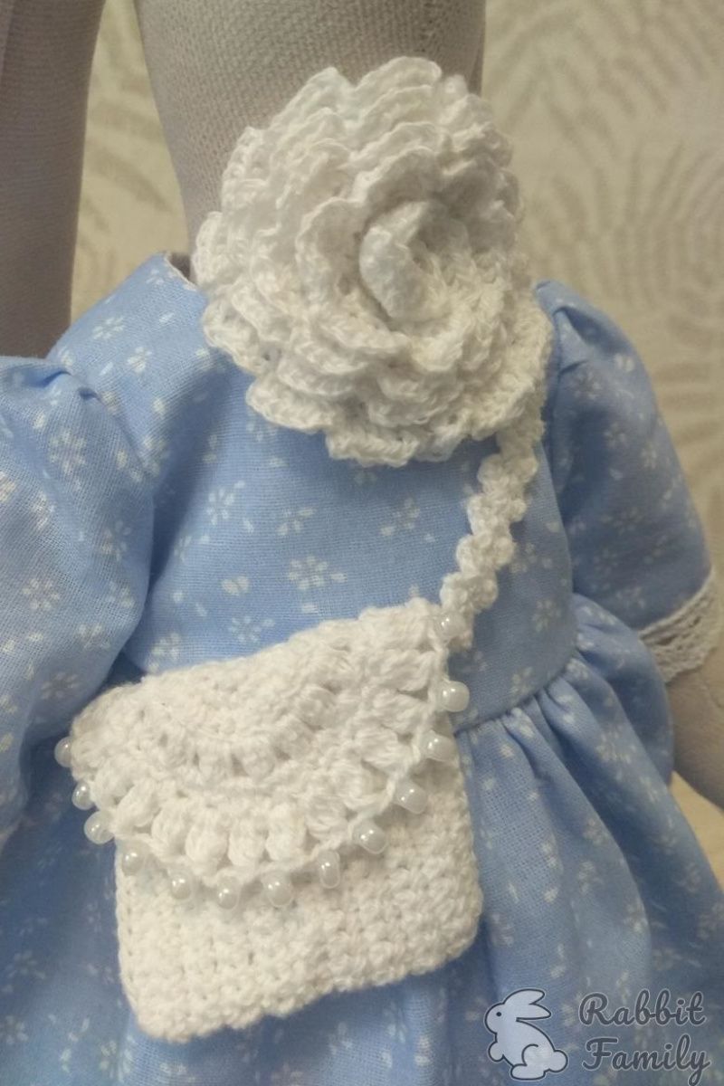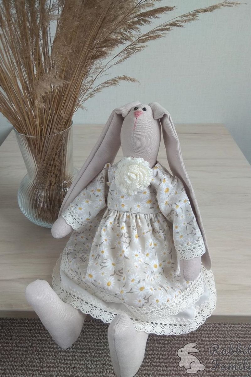 Чарівна зайка шукає собі друга. Виготовлена вручну від п'яток до кінчиків вушок. Гардероб виконаний з натуральної бавовни, мереживо пов'язане вручну. Тіло зайчика - з ніжного, м'якого, приємного на дотик матеріалу. Зайчик - справжня леді і під сукнею у неї спідня білизна у вигляді пантолончиків.
