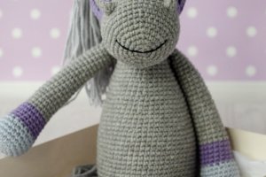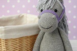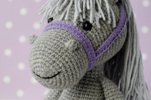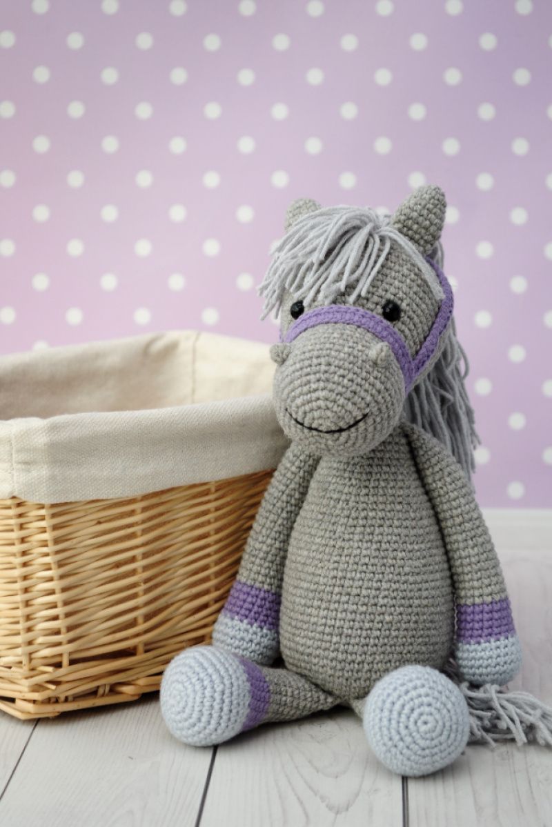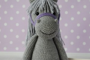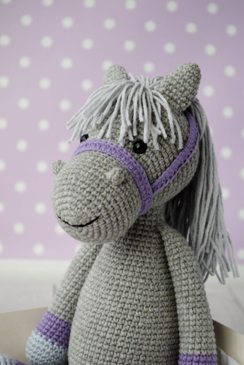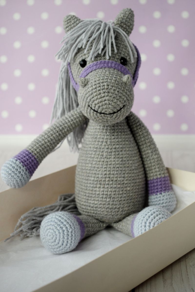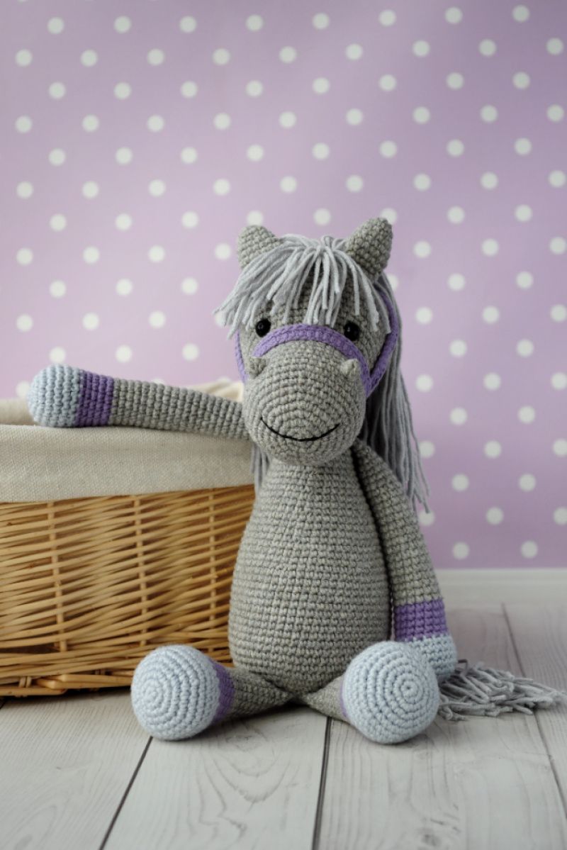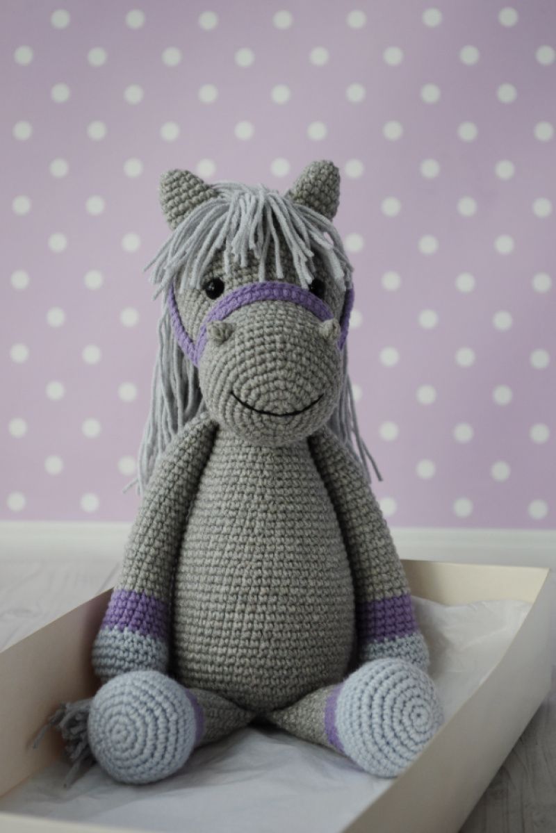 Серед них ось такий чудовий сірий коник! Ріст у іграшки 20-22 см у сидячому положенні ( повний ріст 28-30 см), Зв"язаний з м"якої напів котонової пряжі, наповнювач холлофайбер.