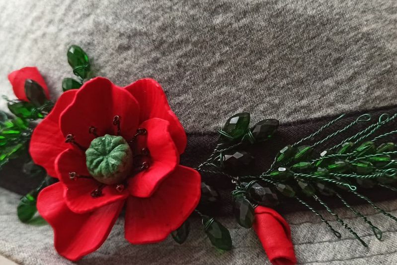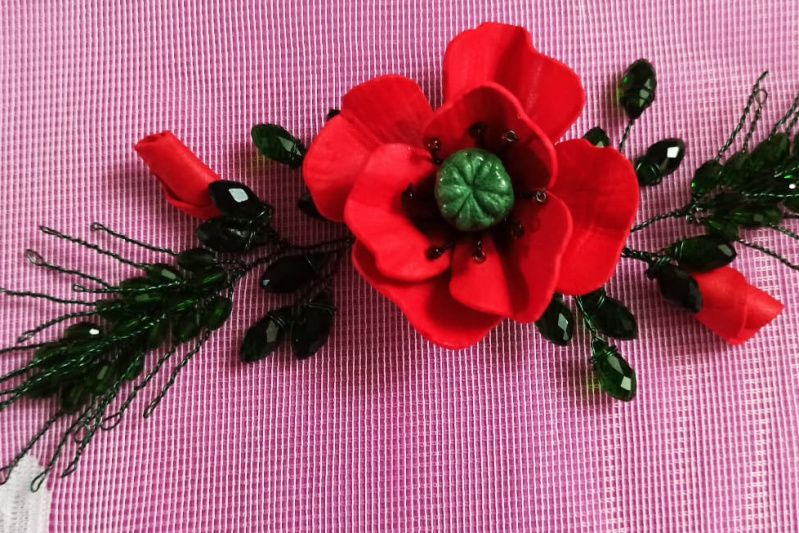 Гілочка руч.роботи в укр.стилі з червон.маком та бутонами з фоамірану, колосками та листочками із зел.намистин, можна використати як прикрасу не тільки в зачісці а й наприклад приколоти на капелюх як на фото.
