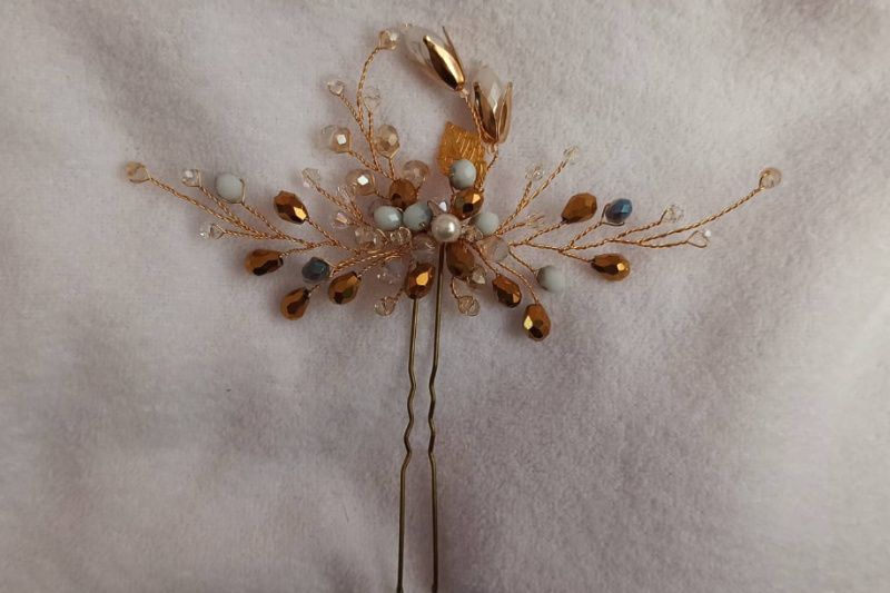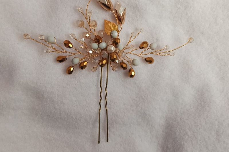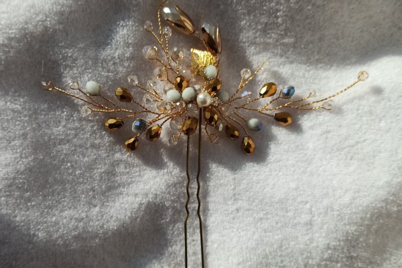 Шпилька в святкову зачіску в золот. кольорі із золотих намистин-капель, кришталевих і білих намистин, бісеру, ювелір.дроту з антиокислююч.покриттям золот.кольору
