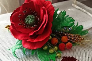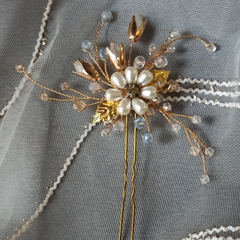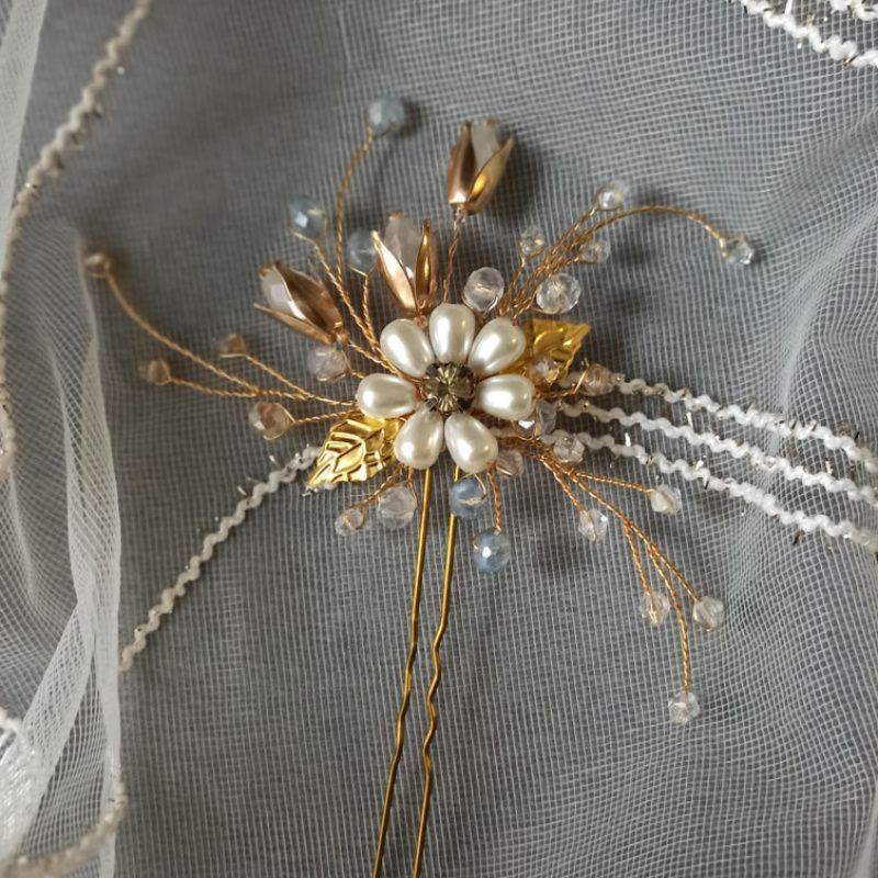 Шпилька в святкову зачіску ручної роботи з білими, кришталевими, кольору "Шампань" намистинами, бісеру, 1 стразом, листочками та ювелір.дротом з антиокислююч.покриттям золот.кольору