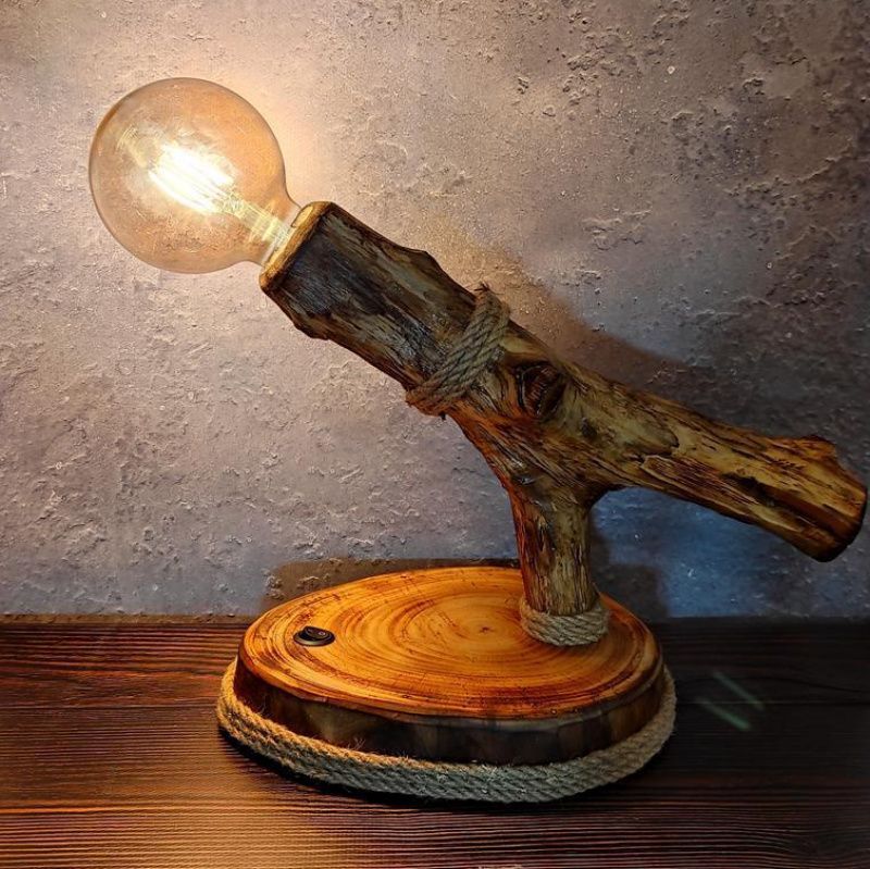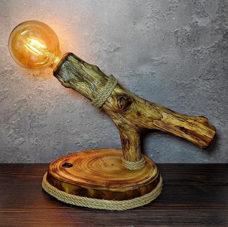 Ексклюзивна, незвичайна лампа з натурального дерева для цінителів природних форм та натуральних матеріалів. Чудово поєднується з безліччю інтер'єрів. Орієнтована для лампочки Едісона. Стане вдалим подарунком шанувальнику дерева в інтер'єрі. Оснащена вимикачем. Провід проходить усередині стовбура дерева. Настільна лампа має стандартний керамічний патрон Е27. У комплекті йде лампочка Едісона (Led) 6W. Висота 30см. Діаметр основи 25см. Довжина дроту 3м.