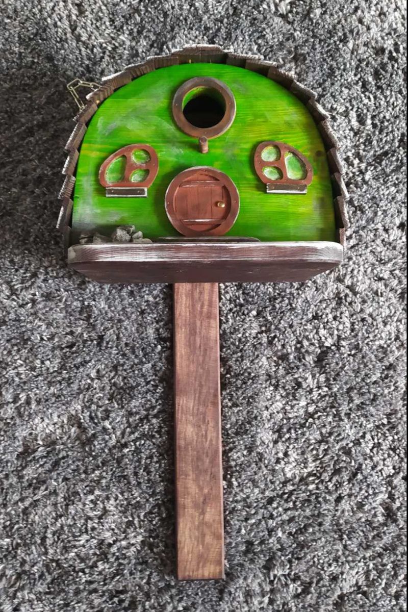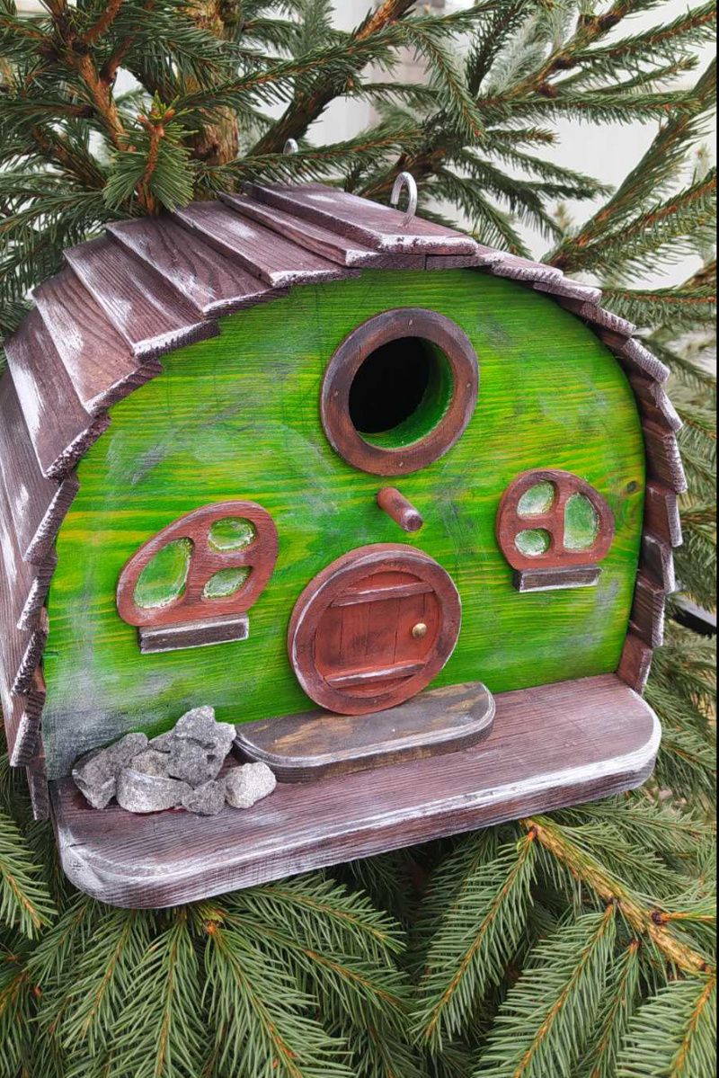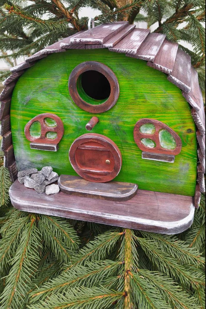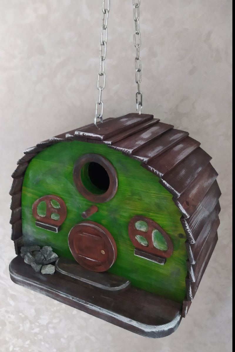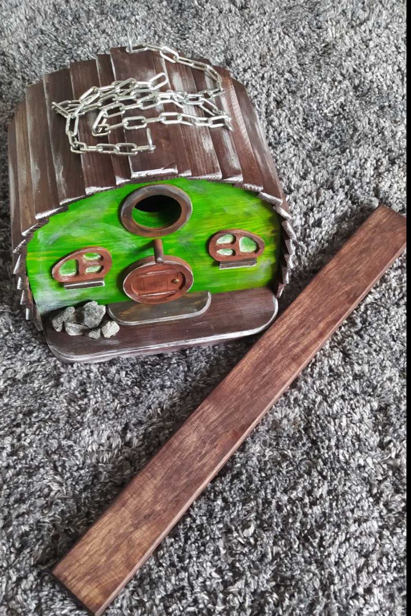 Шпаківня ′Домік Хоббіта ′ виготовлена із дерева, та оброблена масло-воском. Розміри: висота -25см, довжина- 31см, ширина -23см. Шпаківня кріпиться на кронштейн довжиною-64см або на ланцюг. Красивий і компактний будиночок стане новим житлом для перелітних птахів , а також доповнить Ваш інтер′єр подвір′я, саду, дачі. Низ шпаківні розбірний,для того, щоб кожного року очищати середину для прильоту нових птахів.