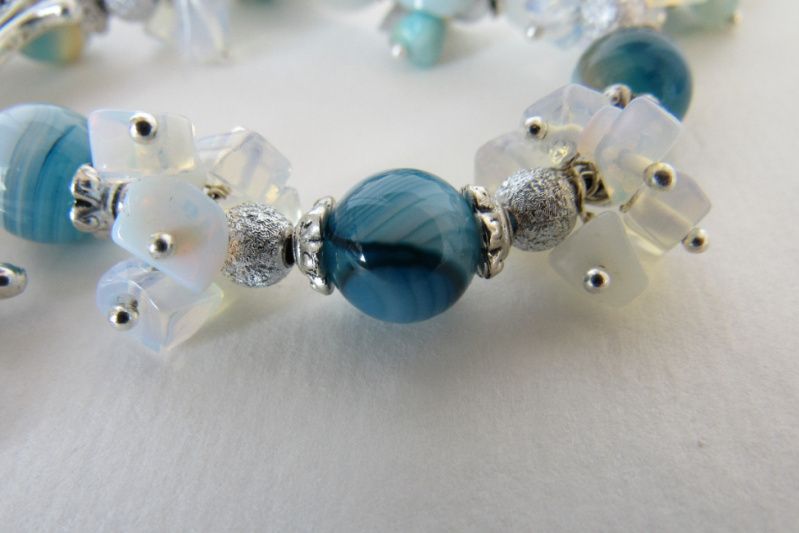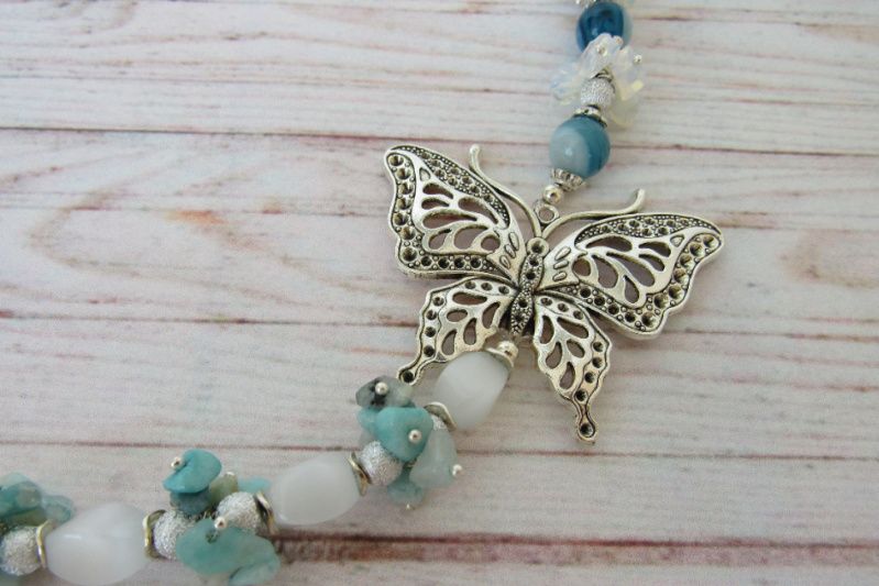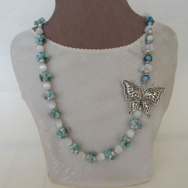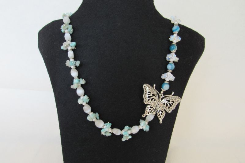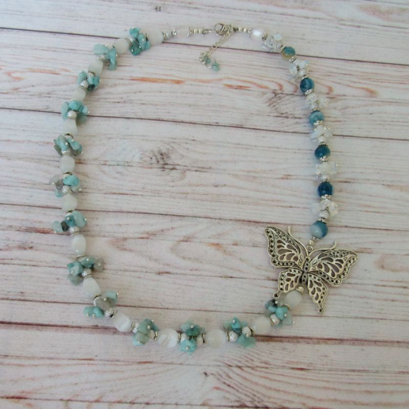 Оригінальне романтичне кольє з натурального каміння,що несе в собі магічну силу природи.Агат-подарує впевненність в собі,амазоніт-камінь амазонок,символ жіночої краси та незалежності,місячний камінь- камінь закоханих та всевидячий захистник,камінь,що приносить удачу-котяче око