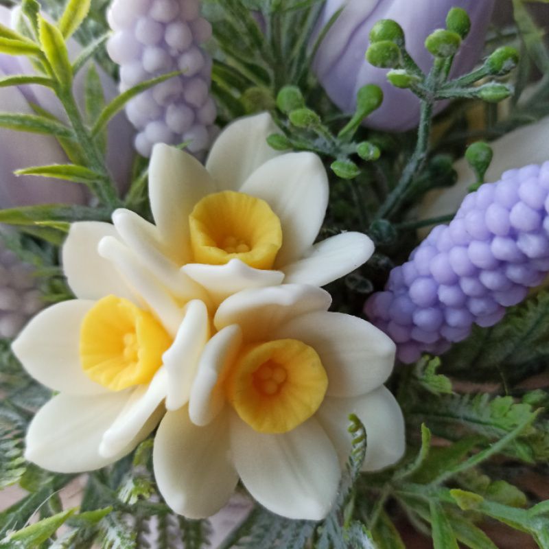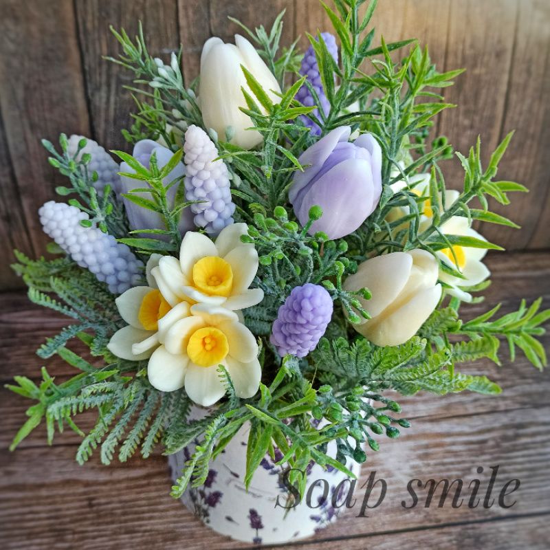 Букет з мила ручної роботи . Мило нарциси , тюльпани , мускарі. Аромати дуже стійкі , тримаються більше року. Упаковано в прозорий пакет перев'язаний атласною стрічкою та біркою і додатково в Крафт пакет з ручками. Флористична зелень високої якості.