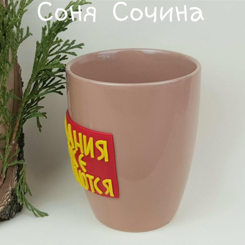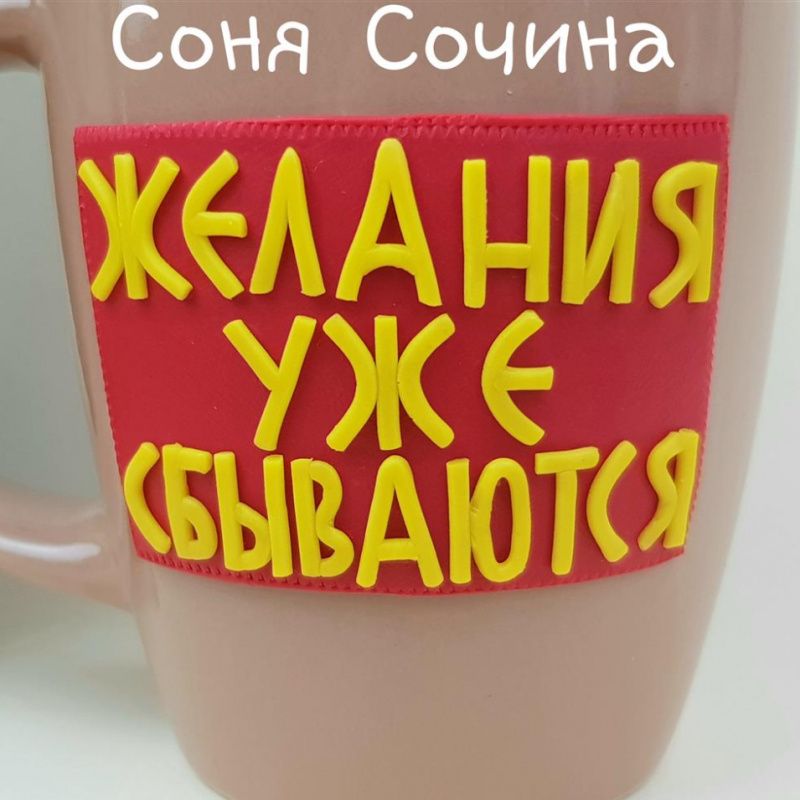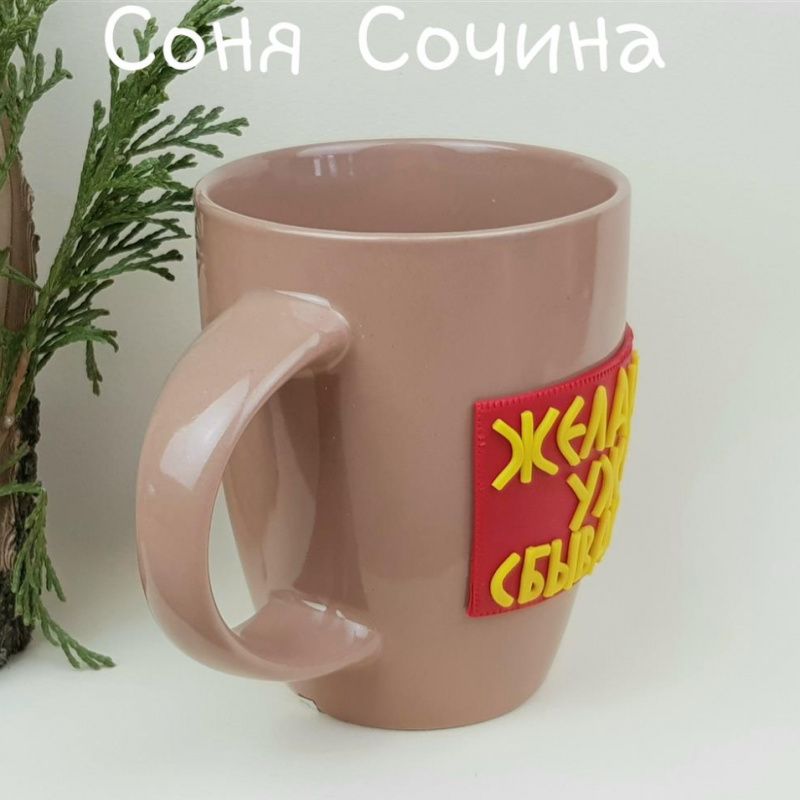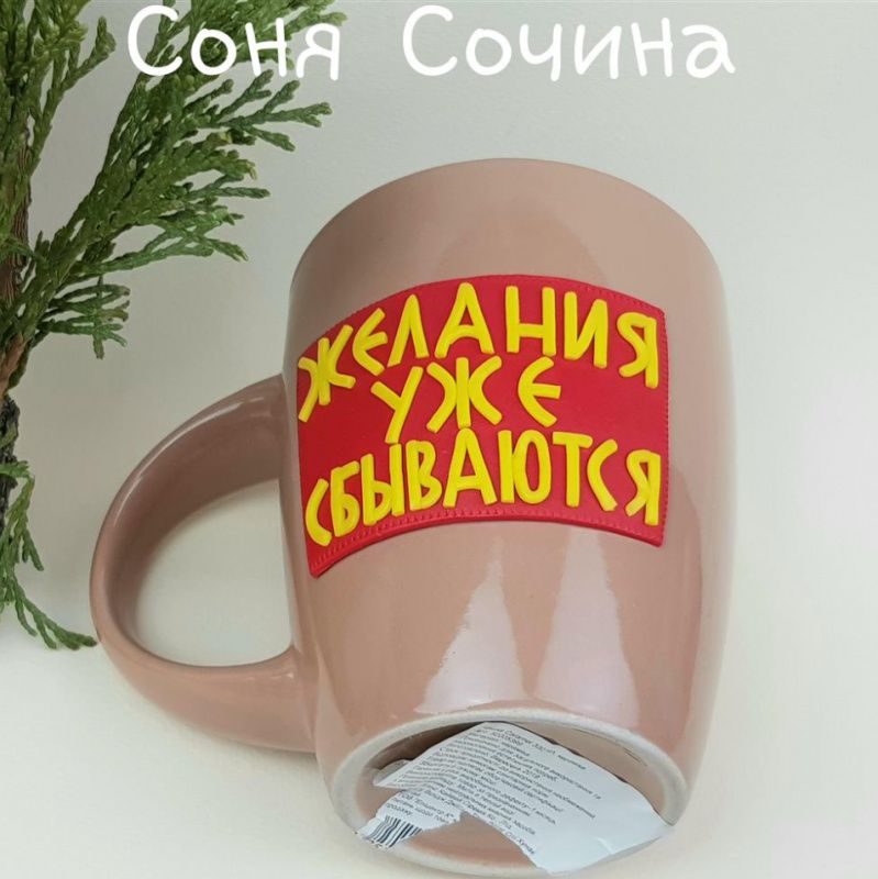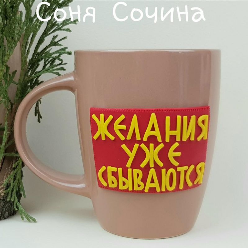 Кольорова чашка з життєстверджуючим написом "Бажання вже збуваються" наповнена заспокійливим чаєм, перед кожною медитацією наводитиме на умиротворені роздуми.