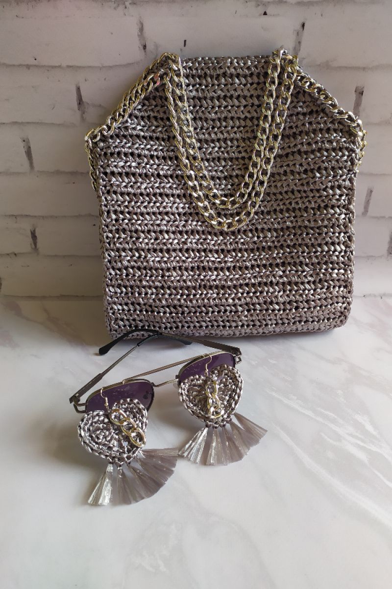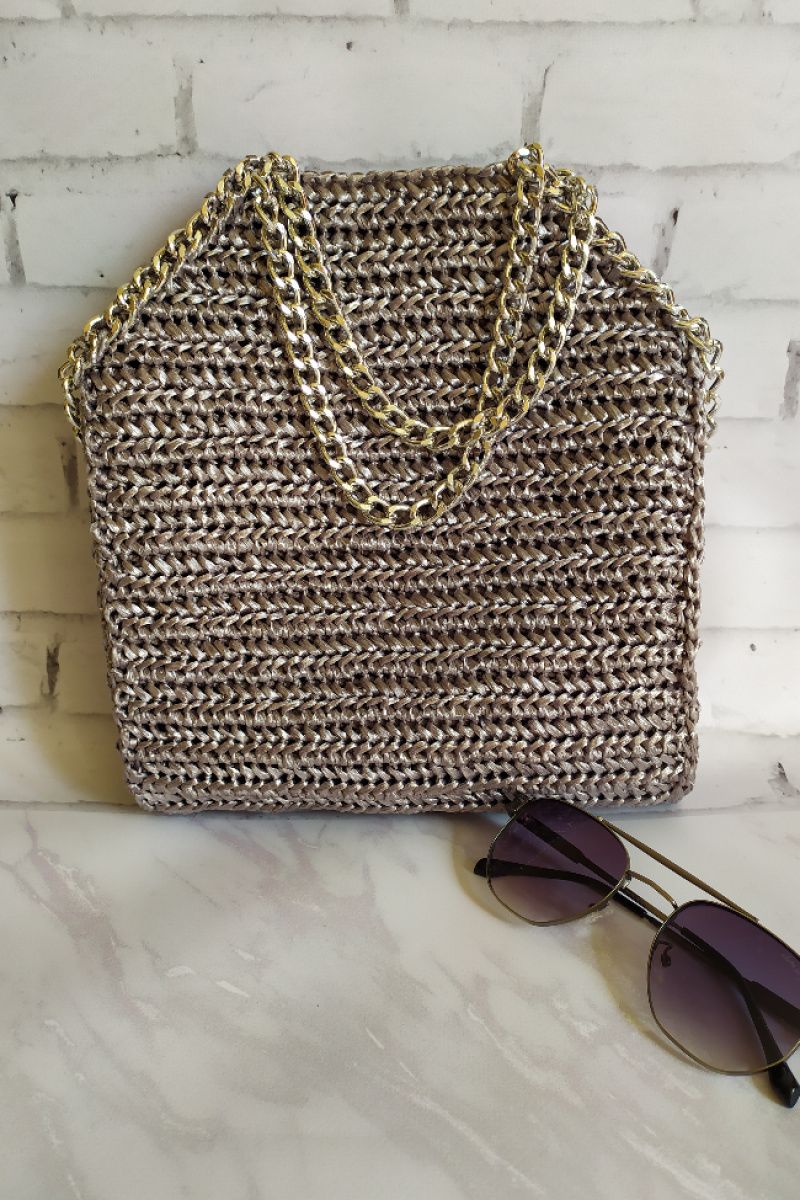 Сумка з рафії з ручками-ланцюгами. На підкладці. Застібка магнітна кнопка.