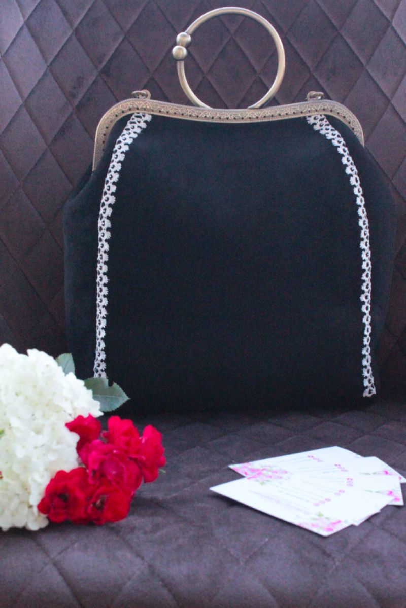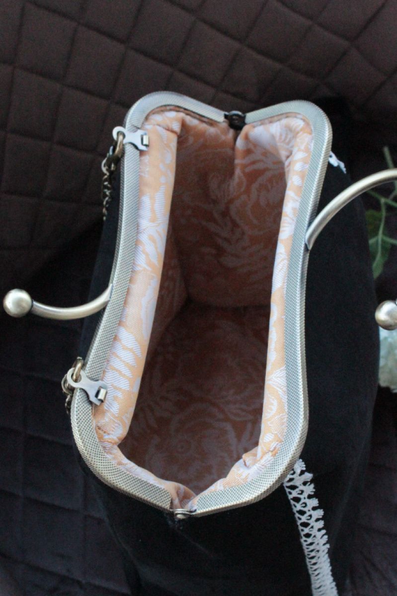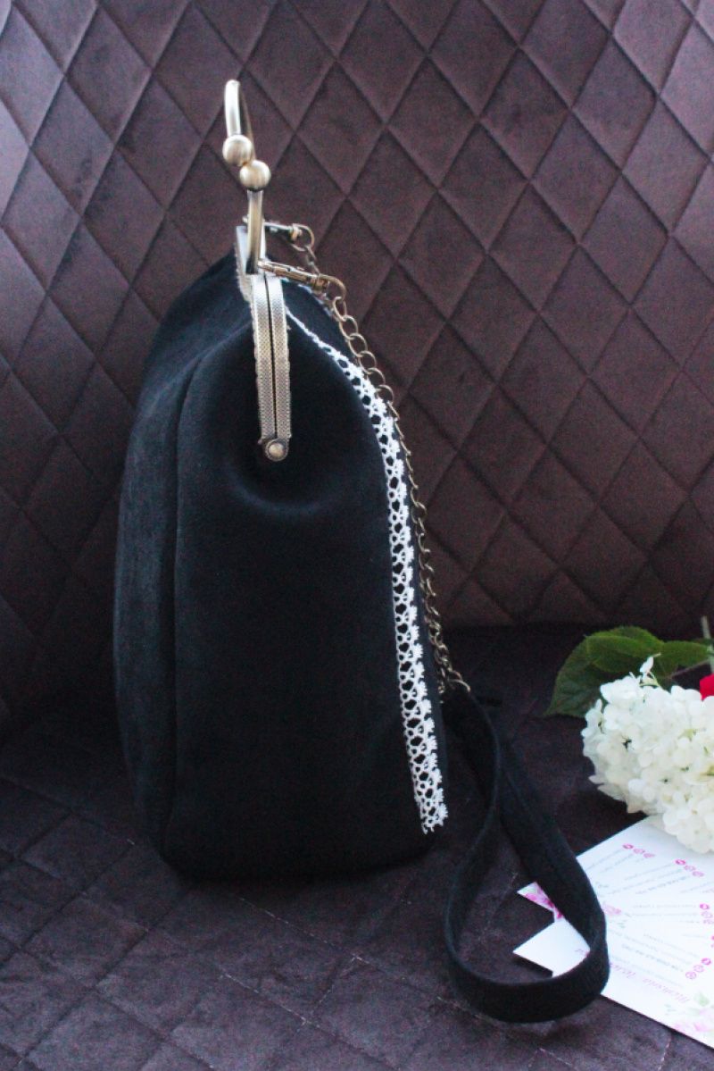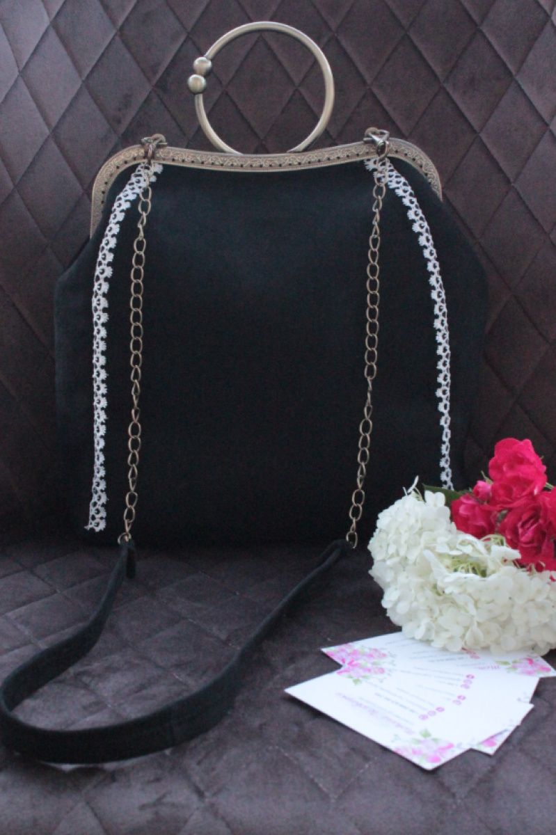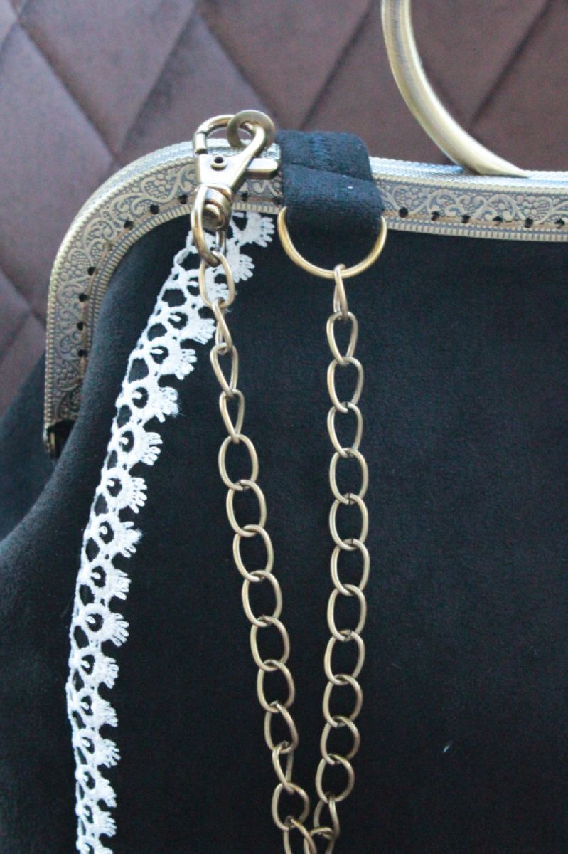 Тканина замш. Всередині підкладка тканина креп. Декоративне мереживо. Укріплена, добре тримає форму, тверде дно. Комбінований ремінець із замші та ланцюжка довжиною 110 см. Фермуар 21 см.