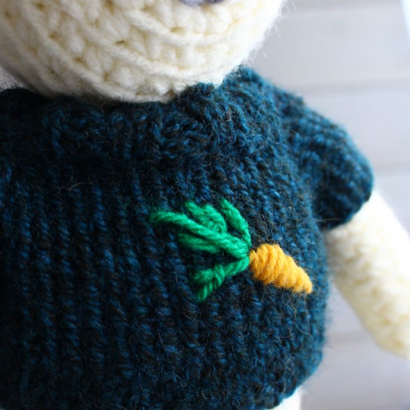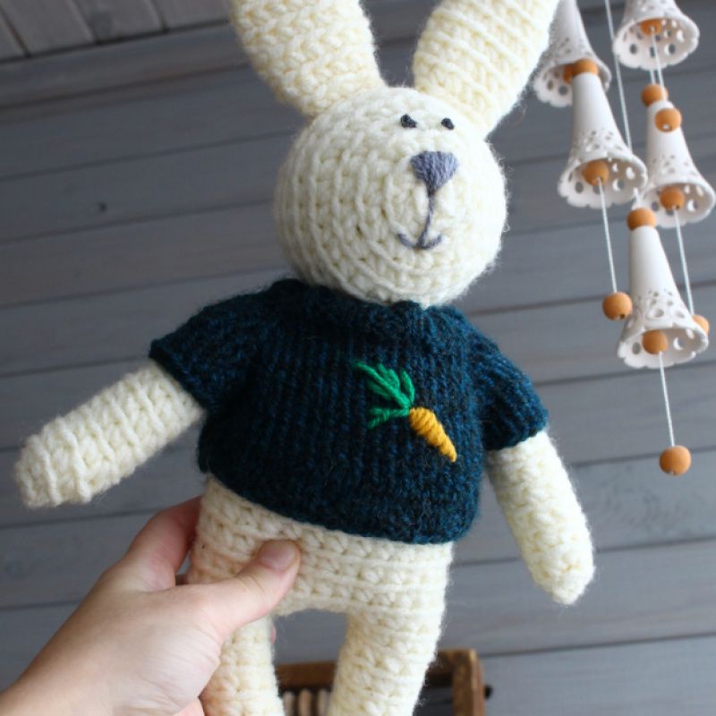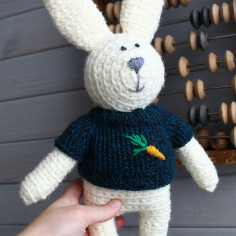 В'язаний зайчик в светрику з вишитою морквинкою, стане чудовим подарунком! Він випромінює тепло , затишок і бажає знайти свій дім)