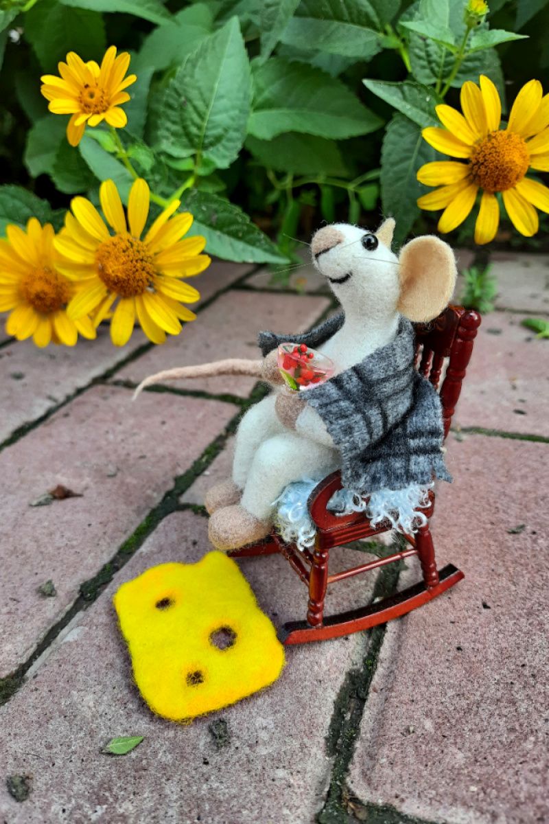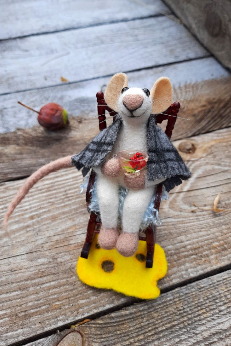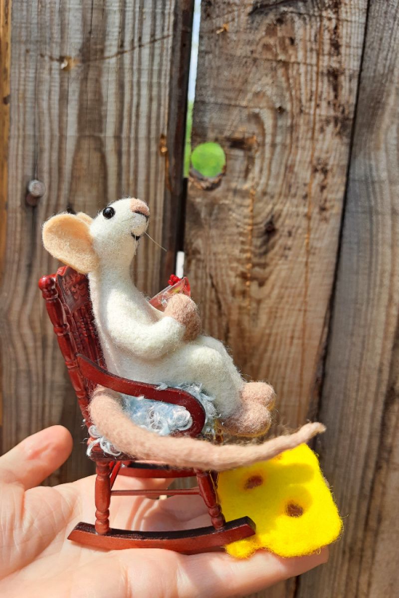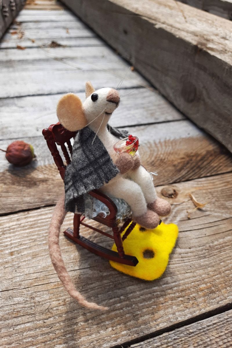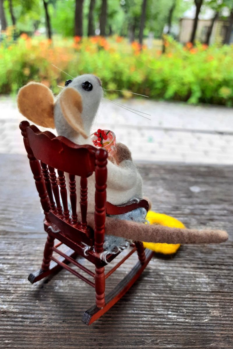 Інтер′єрна іграшка ручної роботи Мишка в кріслі гойдалці. Виконана з натуральної вовни меринос методом сухого валяння. Висота мишки 10.5см. Висота крісла 10см. Матеріал крісла - дерево.