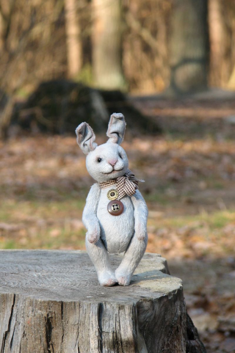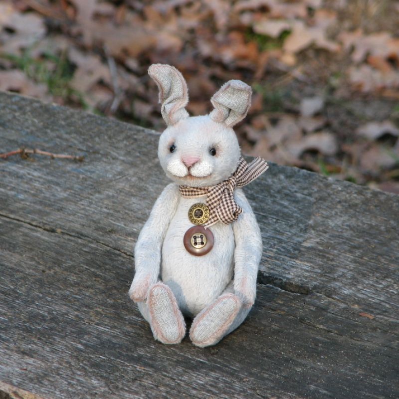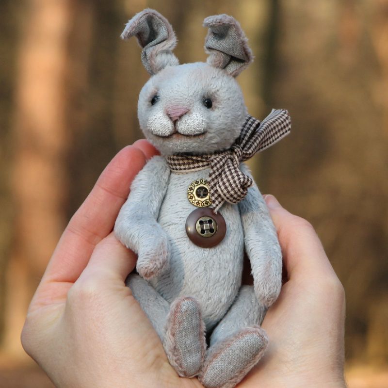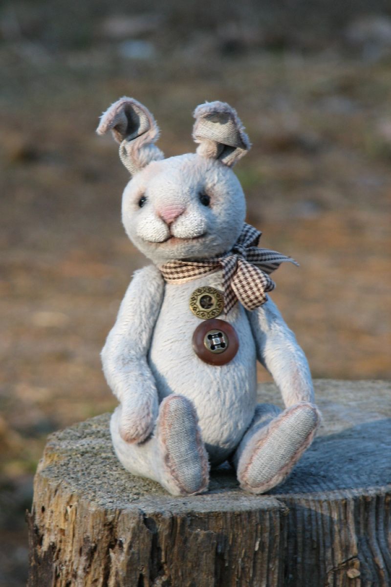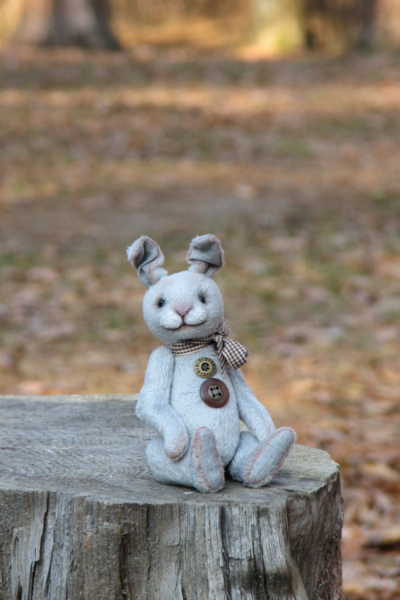 Висота зайчика (без вух) 16см. Пошитий із плюша. Голова крутиться на шплінті, а лапи на міцному нитковому з*єднанні. Тонований масляними художніми фарбами. Прикрашений вінтажними гудзиками і стрічкою.