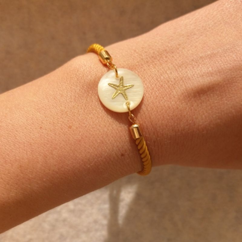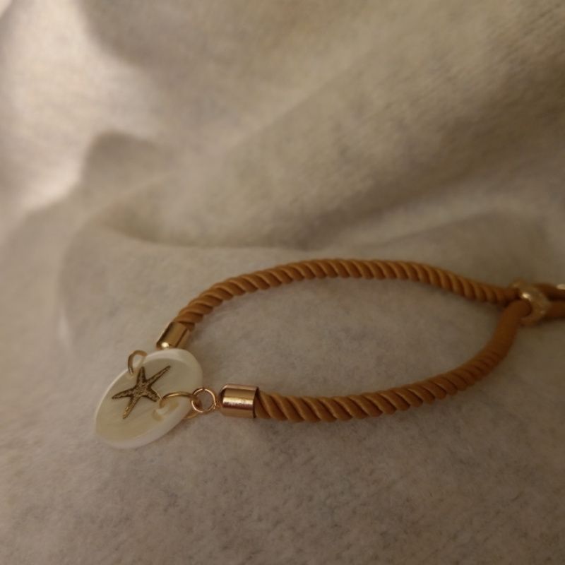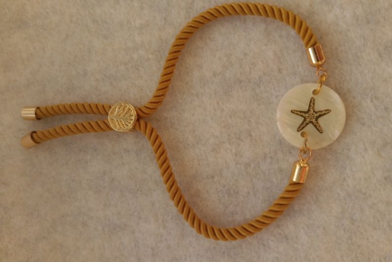 Легкий, зручний браслет. Основа - якісна корейська Фурнітура з рухливим замочком. Завдяки цьому довжина браслету може змінюватися з 19.5 см (це максимум) до потрібного меншого об'єму. Окраса браслету - коло з натурального перламутру і інкрустацією у вигляді морської зірки.