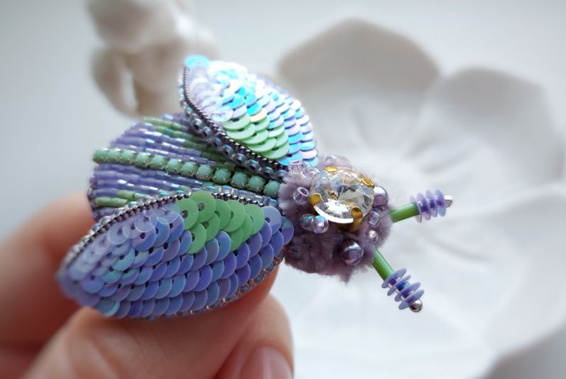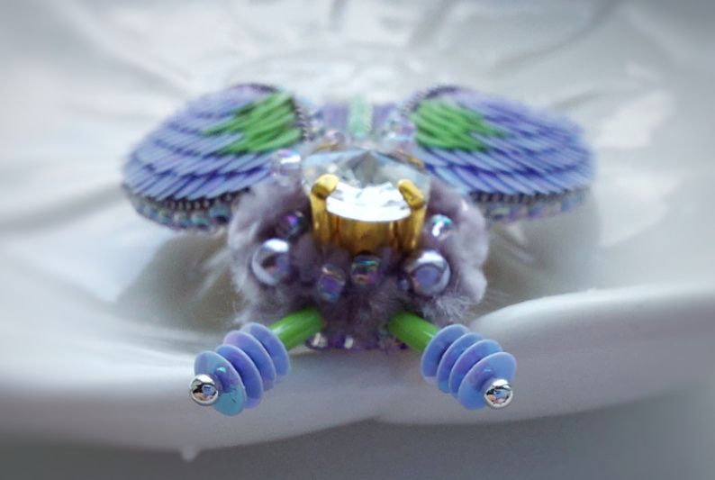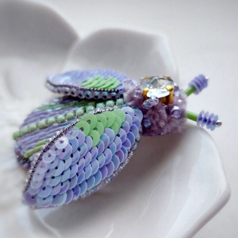Брошка Жужа Бузкова має 3д об'єм. Основа брошки розшита японським бісером і стразовим ланцюжком. Крильця прикрашені італійськими пайєтками.