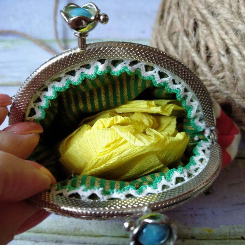 Гаманець-монетниця з срібним фермуаром Виконаний з американського бавовни, всередині декорований мереживом. Розмір 12см на 10см Уцінка !!! Без шлюбу і яких-небудь дефектів, просто трохи в пилу.