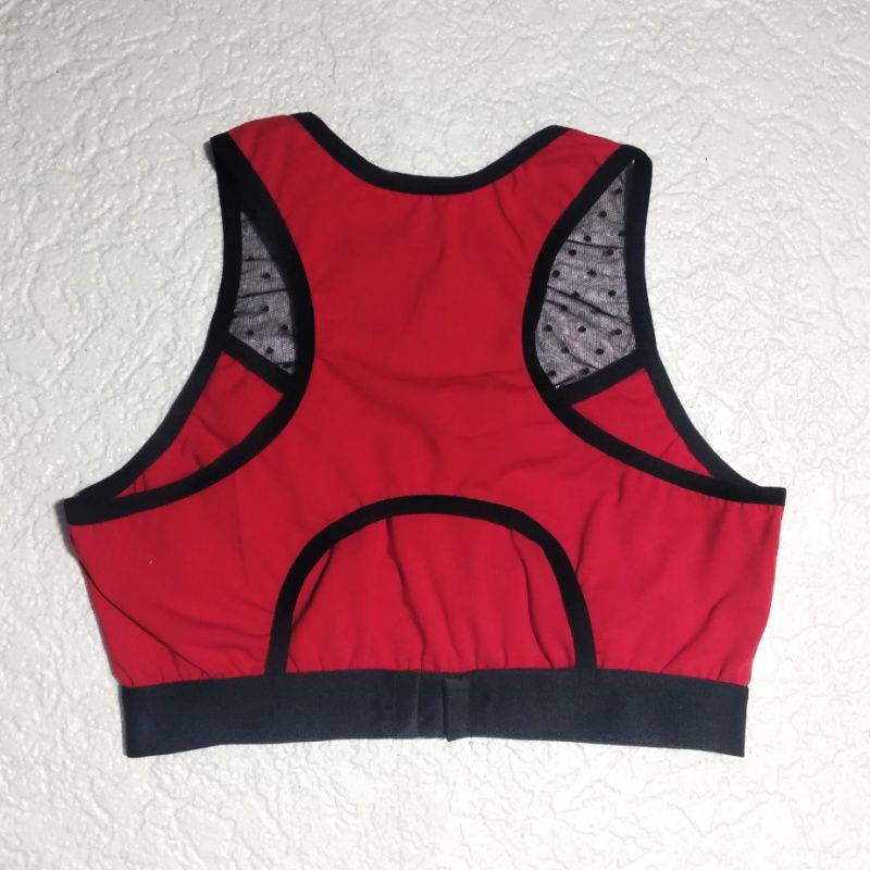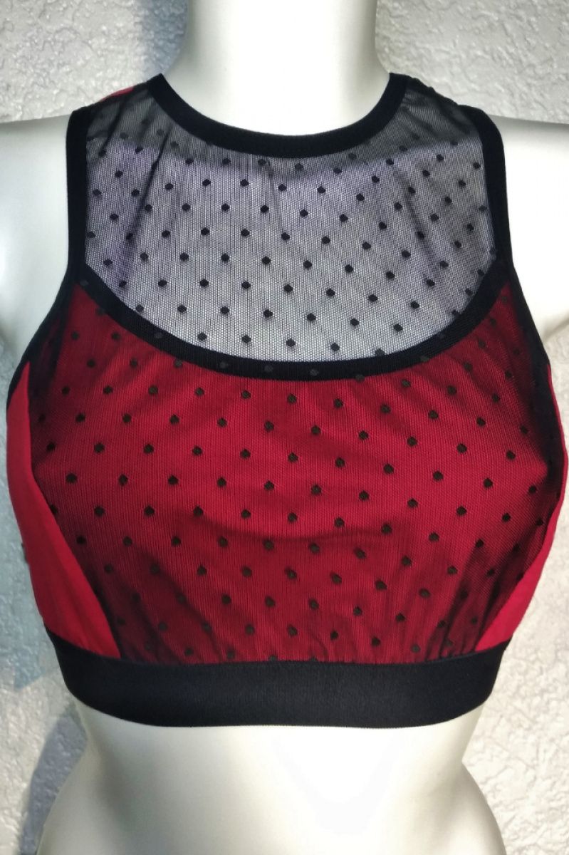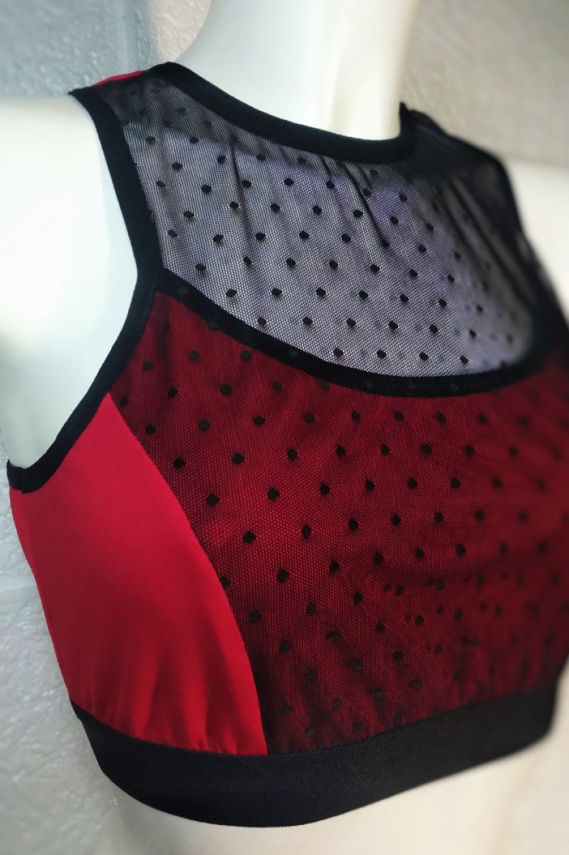 Топ з бавовняного трикотажу прикрашений чорною сіткою з малюнком у вигляді невеликих точок, передня частина топа продубльована другим шаром бавовняного трикотажу для додаткової підтримки, спинка типу борцовки, гумка внизу на застібці на два гачки для зручності одягання і регулювання розміру, довжина топа 36 см, по боковому шву 14 см, можливий пошив по вашим розмірами і в різній колірній гаммі