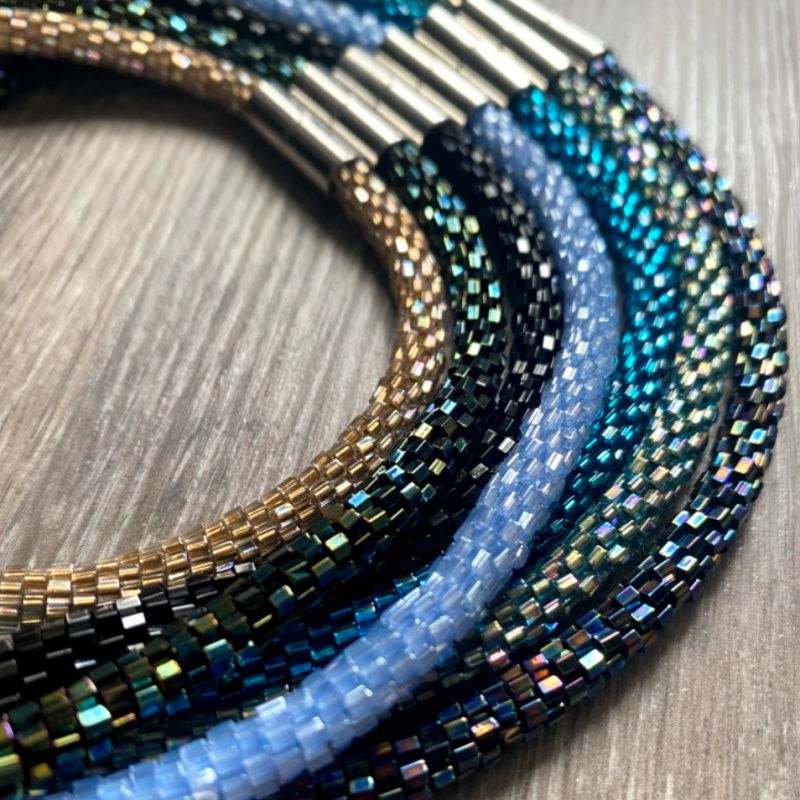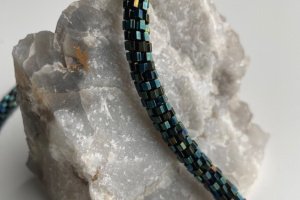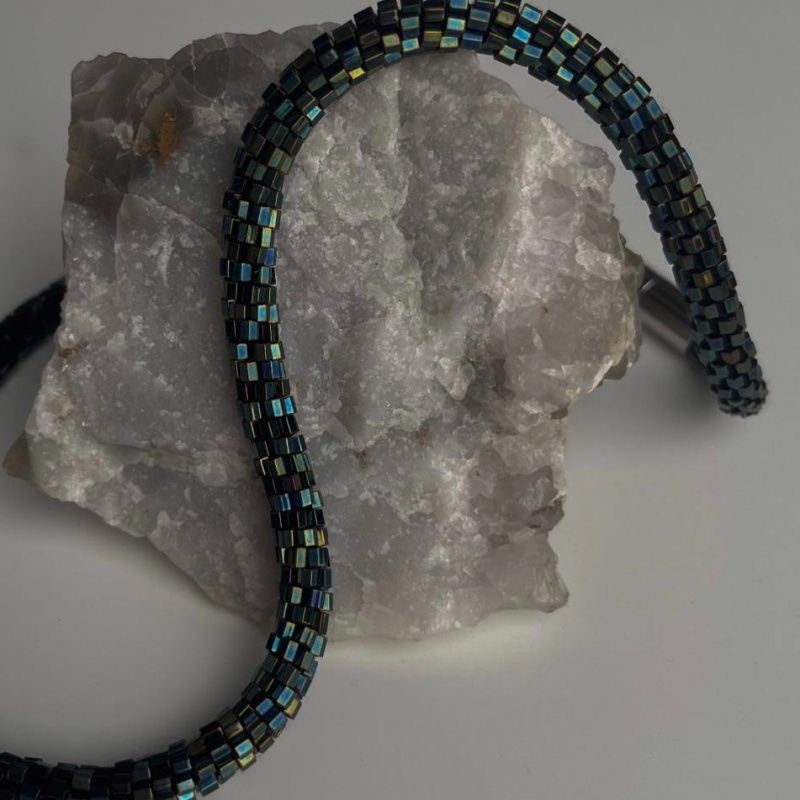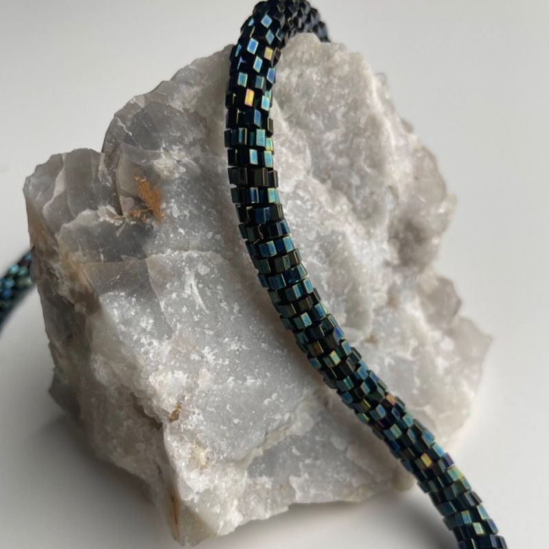 Яскравий та стильний жгут на шию, під будь-який стиль та зовнішність, зроблений з якісного японського бісеру, має магнітну застібку з нержавіючої сталі. Плететься гачком, що дає можливість жгуту мати тонкий круглий вигляд та міцність. Довжина виробу - 40см