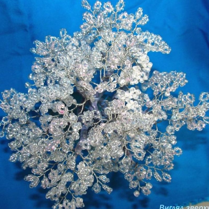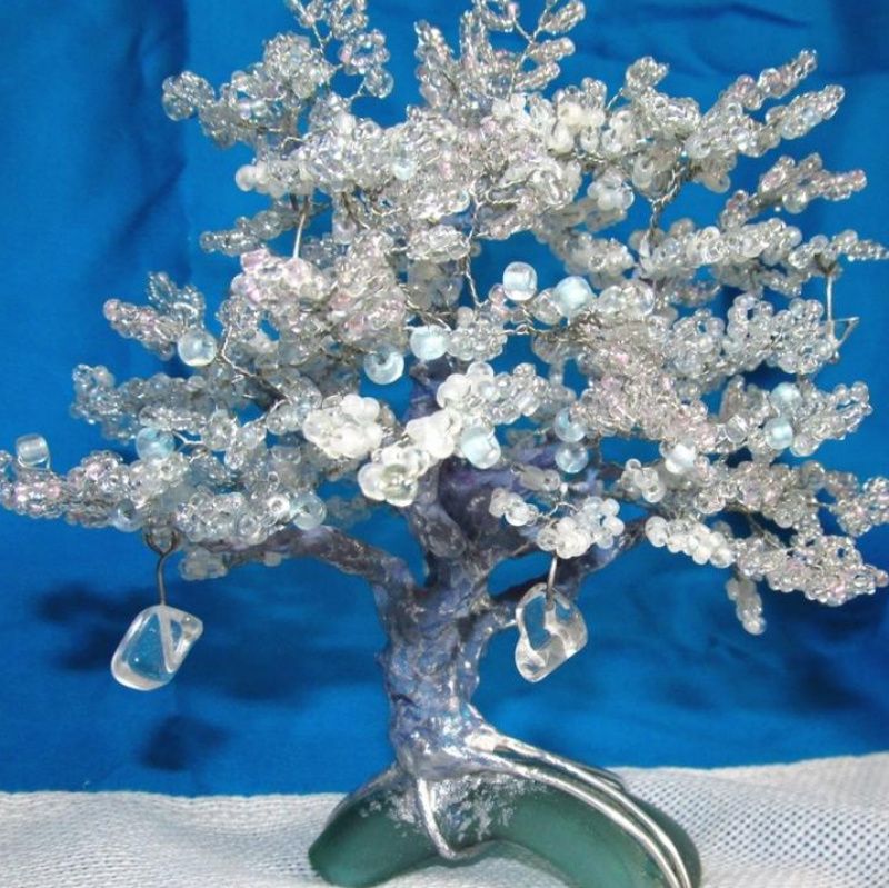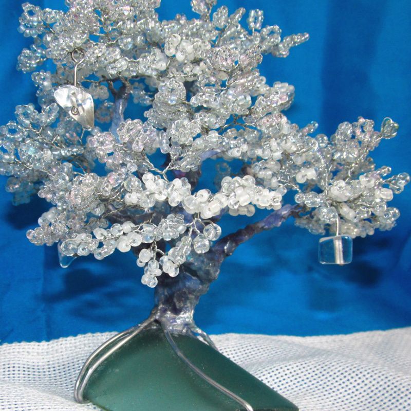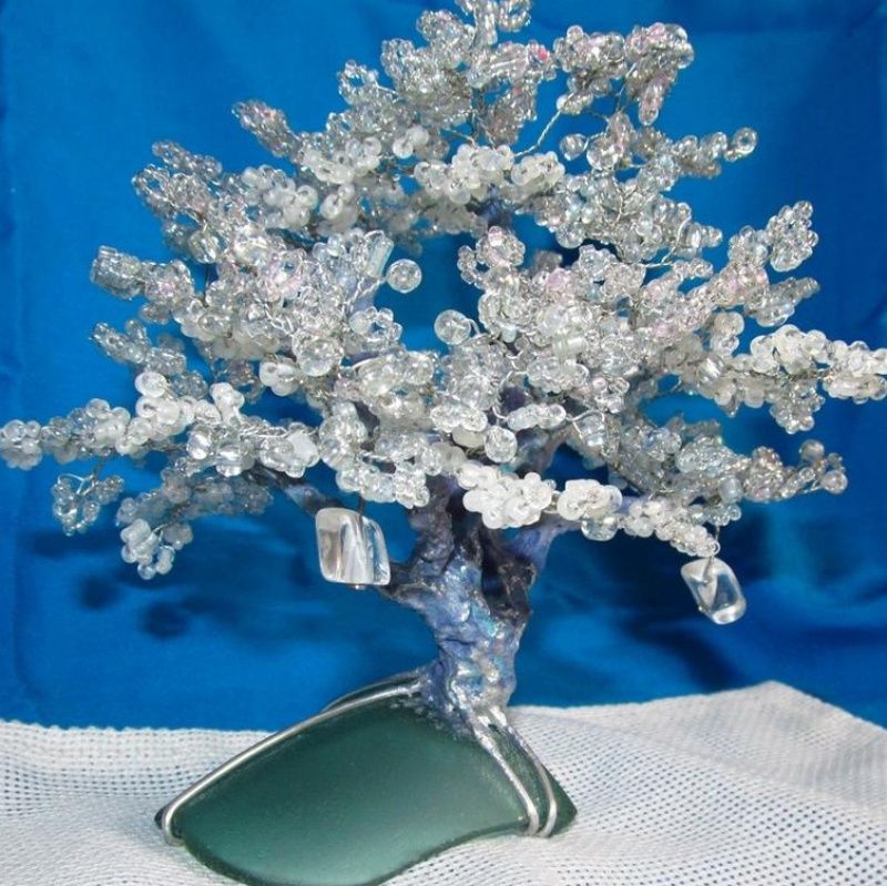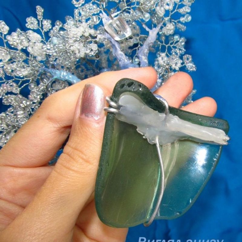Матеріали: скляний бісер різного розміру, прозорий а також бузкового і рожевого відтінків; алюмінієвий дріт; термоклей; акрилові паста, фарби, лак; кілька скляних камінчиків; основа - шматок відшліфованого матового скла.