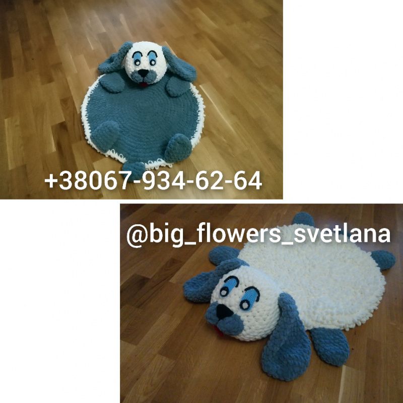 Килимок іграшка подушка з гіппоалергенна пряжі, легко стірается.Ребенок буде в захваті від милого друга собачки. Відправка новою поштою, самомивоз Київ. Оплата післяплатою або на картку приват. Більше інформації пишіть