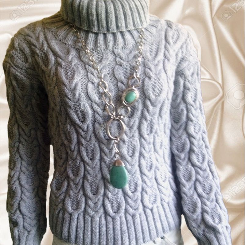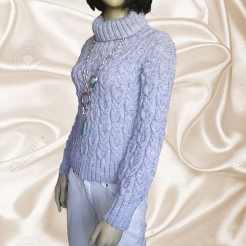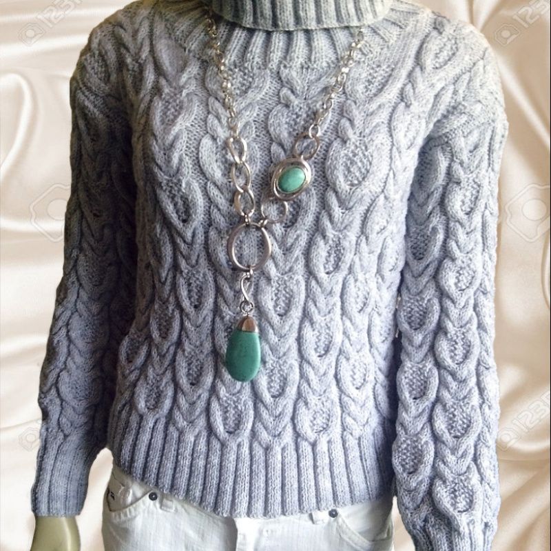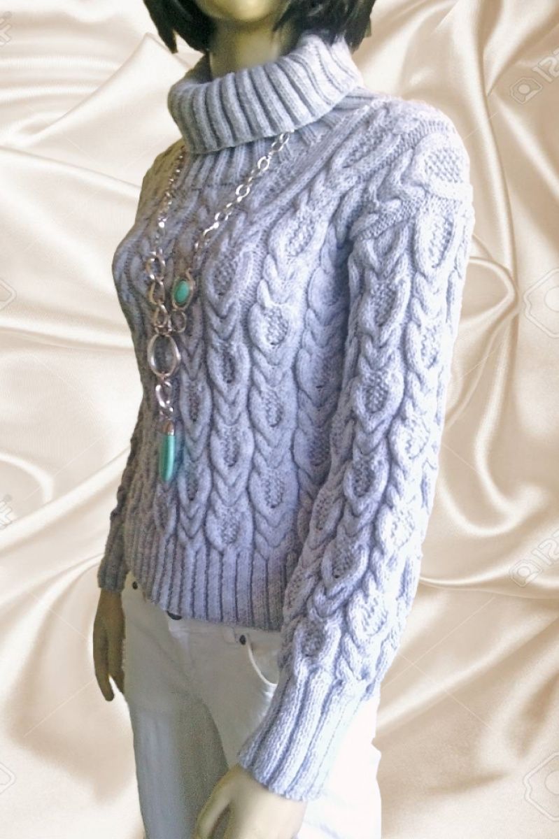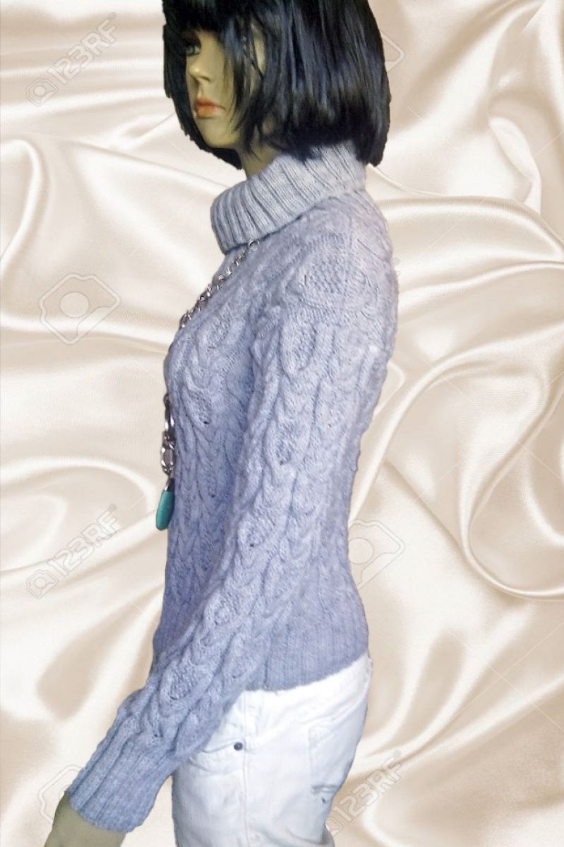 Світло-сірий, злегка меланжевий (що надає мармуровий відтінок) светр. Пов'язано з напіввовняної м'якою і теплою пряжі. Високі гумки і вільний комір, рельєфний малюнок, що включає чергування кіс і Аран, роблять светр привабливим, помітним і яскравим. Вам буде тепло і затишно в холодну осінньо-зимову погоду. Склад пряжі 50% шерсть, 50% акрил.