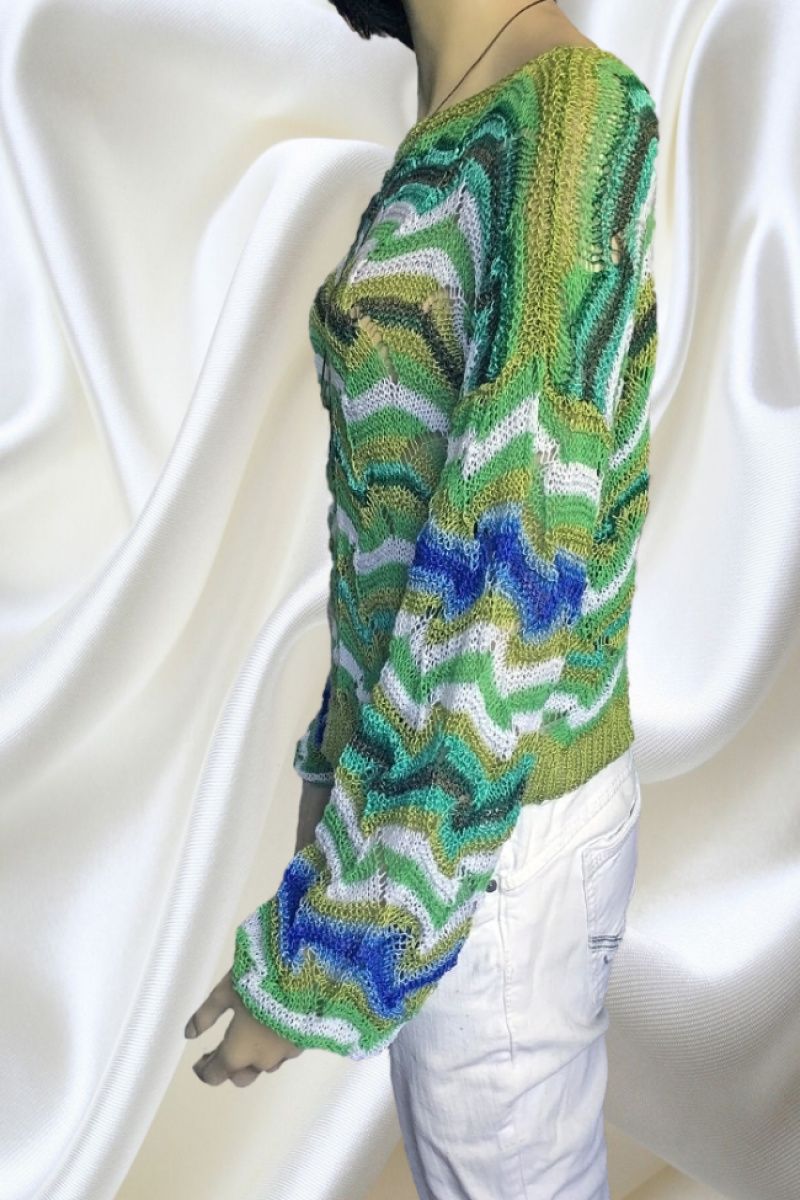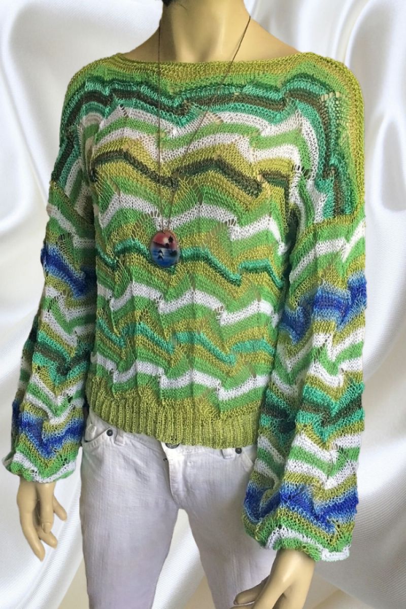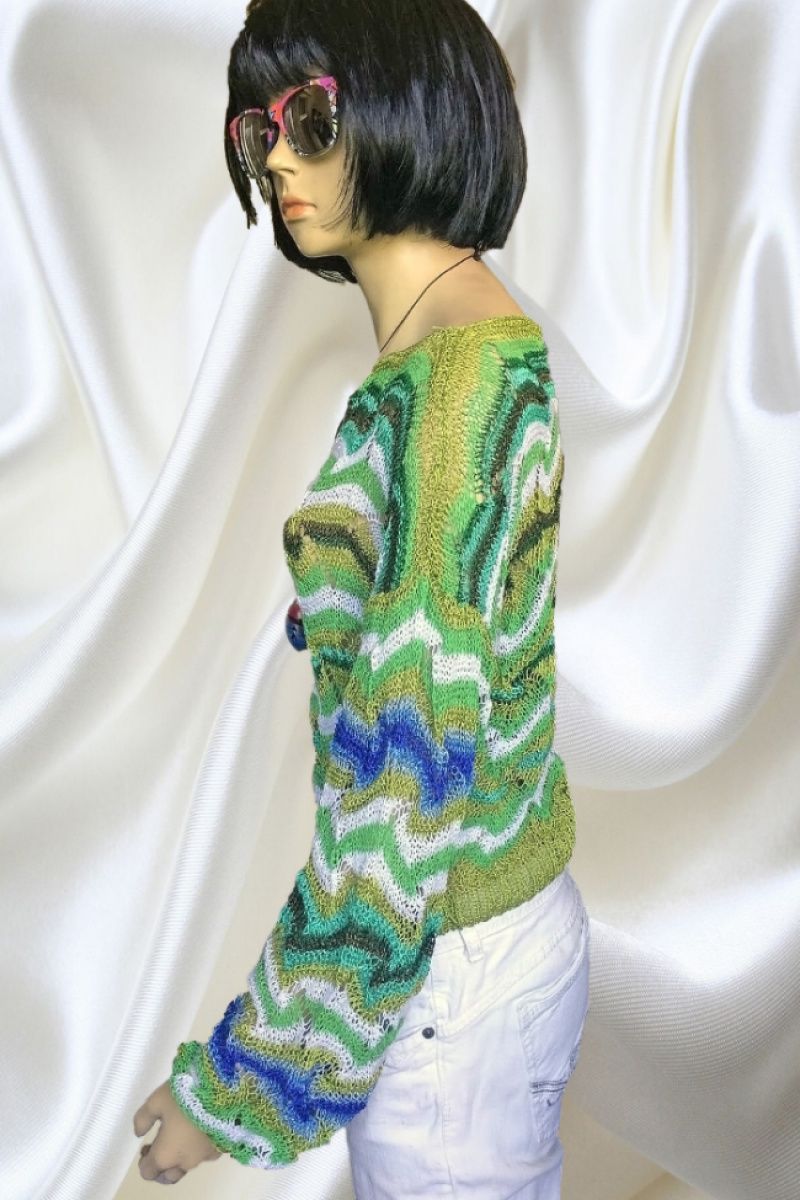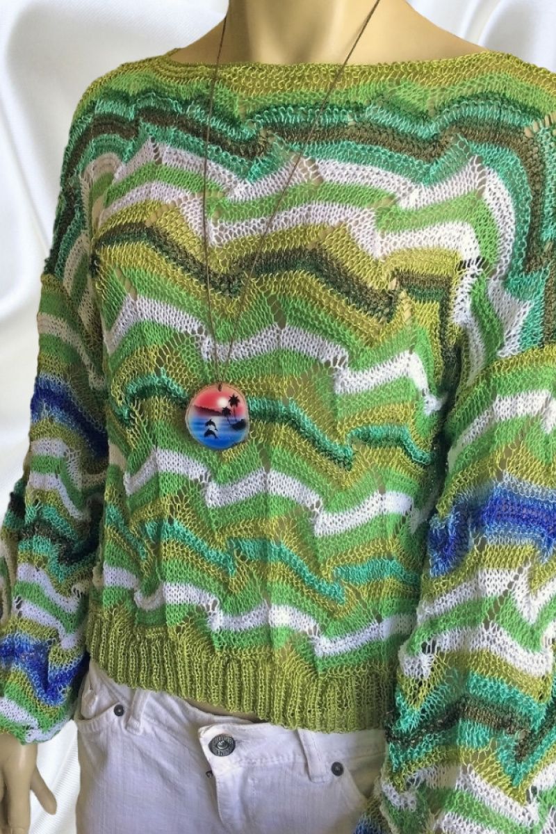 жіночий джемпер Міссоні-оверсайз в смужку з 100% хлопка.Ажурний, легкий, з ретельно підібраними кольоровими смужками джемпер в весняних кольорах. безсумнівно буде яскравим, стильним, виділяє вас з толпи.Свободний оверсайз з довгим широким рукавом на невисокій щільною гумці, актуальний і для весни і для літа. Дуже добре виглядає з будь-якими брюками і спідницями. Також красиво гармонує з шортами. Дерев'яний кулон ручної роботи і розпису відмінно доповнює джемпер.